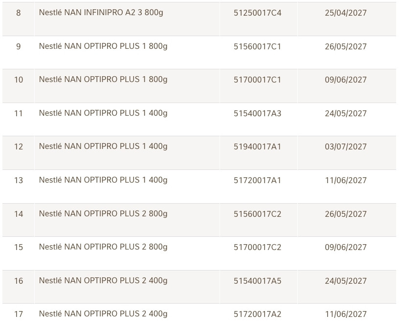 Danh sách 17 lô sữa NAN vừa được Nestlé Việt Nam thu hồi