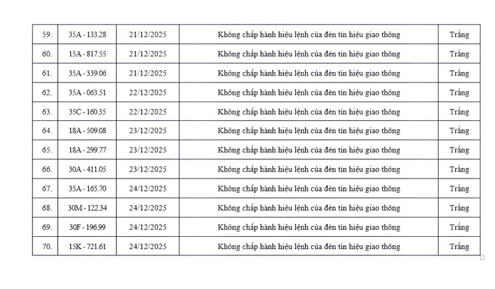 Theo thông tin từ Phòng Cảnh sát giao thông (CSGT) công an tỉnh Ninh Bình, trong khoảng thời gian từ ngày 16/12/2025 đến ngày 24/12/2025, hệ thống camera giám sát giao thông ứng dụng trí tuệ nhân tạo (AI) do đơn vị này vận hành đã ghi nhận 70 hành vi vi phạm trật tự, an toàn giao thông trên địa bàn tỉnh.