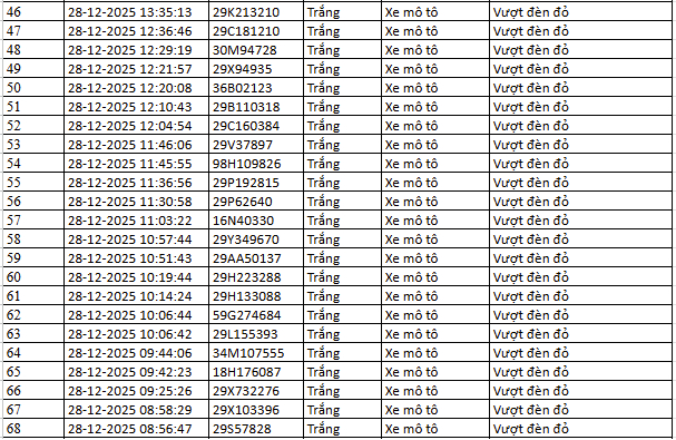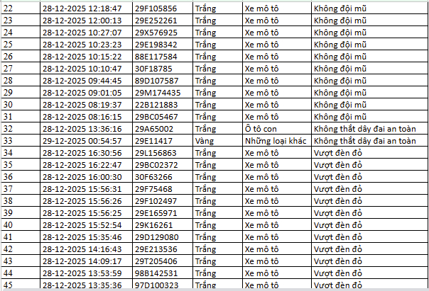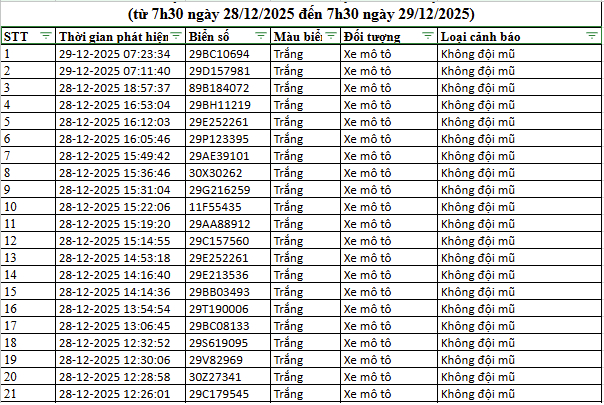 Theo số liệu từ Cục Cảnh sát giao thông (CSGT), trong vòng 24 giờ qua (từ 12h00’ ngày 28/12/2025 đến 12h00’ ngày 29/12/2025), hệ thống camera AI thí điểm tại nội đô Hà Nội và các tuyến cao tốc trọng điểm đã hoạt động hiệu quả, tự động nhận diện và trích xuất dữ liệu nhiều trường hợp vi phạm trật tự an toàn giao thông.