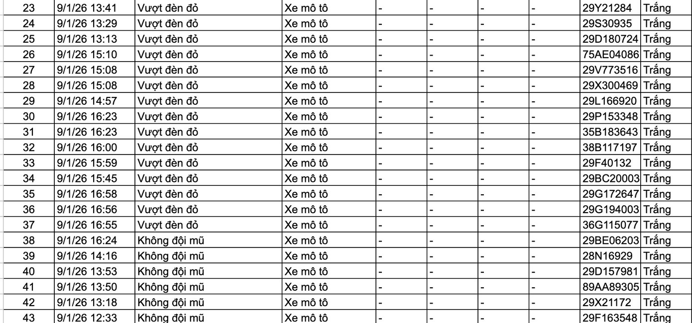 Danh sách các phương tiện vi phạm: