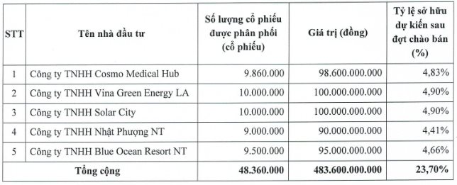 Với 48,36 triệu cổ phiếu còn lại, HĐQT BMS thông qua việc tiếp tục chào bán lượng cổ phiếu này cho 5 tổ chức. Trong đó, Công ty TNHH Vina Green Energy LA và Công ty TNHH Solar City mỗi doanh nghiệp dự mua 10 triệu cổ phiếu; Công ty TNHH Cosmo Medical Hub dự mua 9,86 triệu cổ phiếu; Công ty TNHH Blue Ocean Resort NT dự mua 9,5 triệu cổ phiếu và Công ty TNHH Nhật Phượng NT dự mua 9 triệu cổ phiếu.