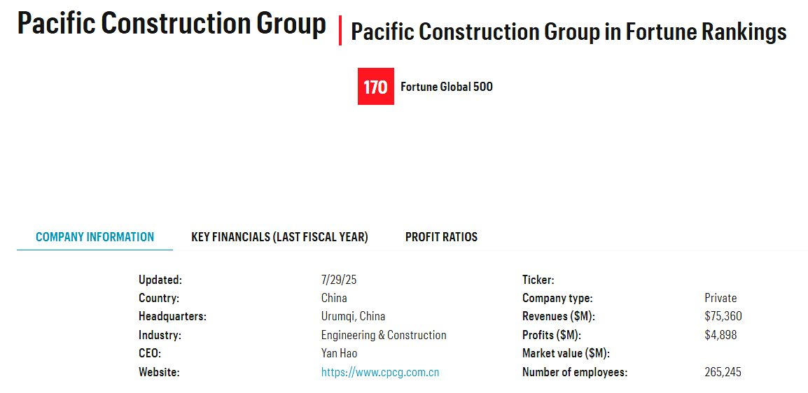 Theo bảng xếp hạng Fortune Global 500 công bố tháng 7/2025, Tập đoàn Xây dựng Thái Bình Dương ghi nhận doanh thu năm 2024 đạt 75,36 tỷ USD, lợi nhuận 4,9 tỷ USD, xếp hạng 170 toàn cầu. Đây là năm thứ 12 liên tiếp CPCG góp mặt trong danh sách này.