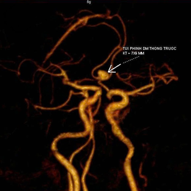 Kết quả phát hiện túi phình kích thước 7×9mm tại đoạn động mạch thông trước, cổ rộng, vị trí có nguy cơ vỡ rất cao, dễ gây xuất huyết não và đột quỵ nguy hiểm. (Ảnh: BVCC)