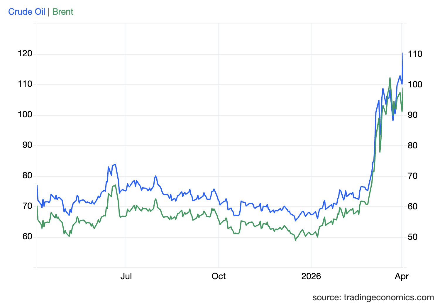 Giá dầu thô West Texas Intermediate (WTI) kỳ hạn tháng 5 của Mỹ tăng 10% lên 110,21 đô la một thùng vào lúc 8:13 sáng giờ ET. Giá dầu thô Brent kỳ hạn tháng 6 tăng 8% lên 109,25 đô la một thùng. Lần đầu tư khi xung đột nổ ra, giá dầu WTI đã vượt dầu Brent.