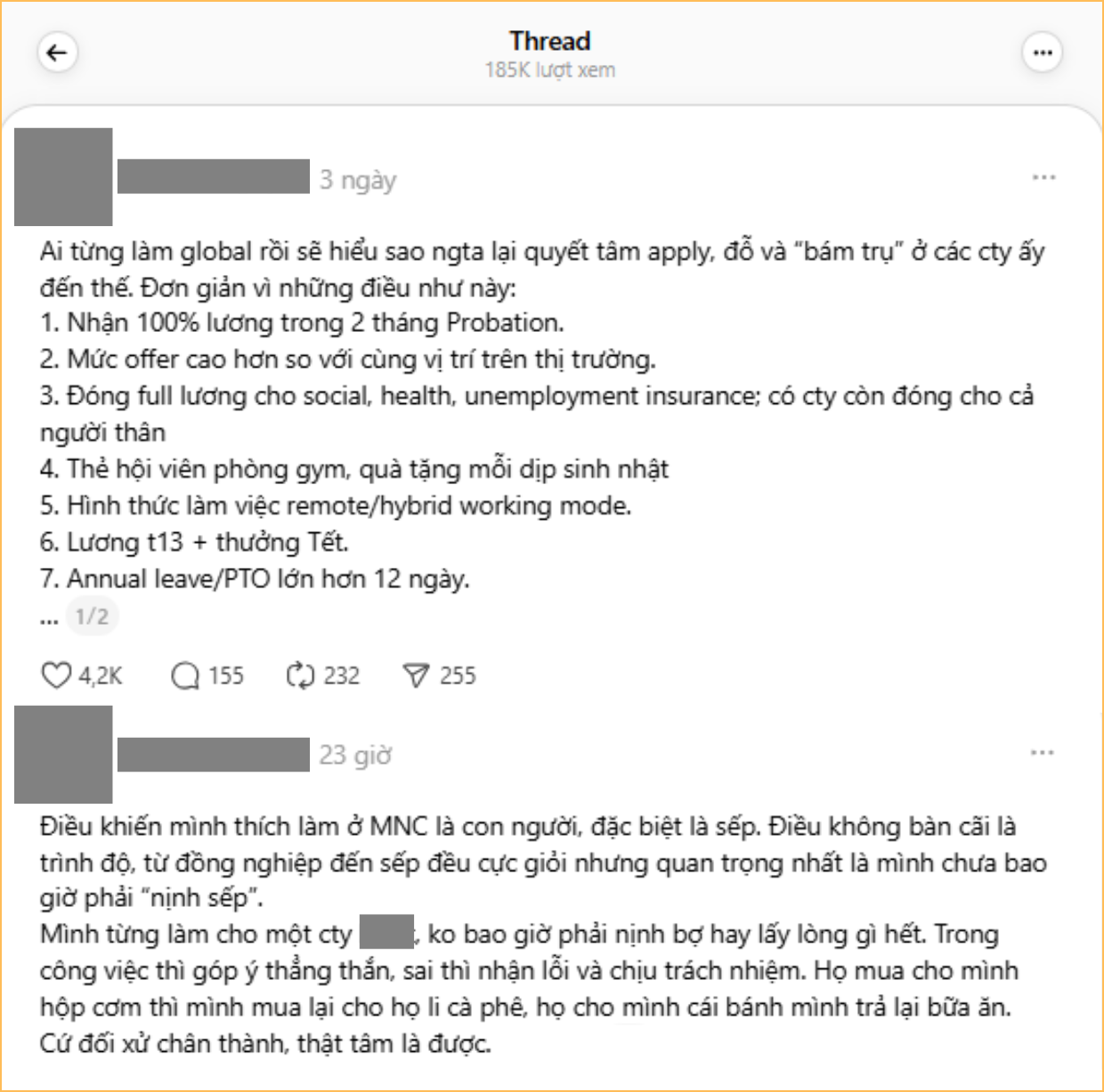Một người cũng bước ra từ tập đoàn lớn, bình luận: “Nghỉ làm ở tập đoàn đa quốc gia, ngoài lương thưởng, đãi ngộ, thì cái mình tiếc nhất chính là đồng nghiệp. Trong môi trường ấy, phần lớn nhân sự đều có nền tảng rất tốt, họ thông minh, tư duy hiện đại và định hướng rõ ràng cho sự nghiệp, biết nên bổ sung kỹ năng nào, nên học thêm gì, nên “ở đâu” trong 3-5 năm tới. Kiểu mình ở trong môi trường đó, tiếp xúc và làm việc với những người như vậy, mình tự khắc có chí tiến thủ, có động lực học tập, phát triển bản thân lẫn sự nghiệp ấy. Nói chung là xịn, tất cả mọi thứ đều xịn”.