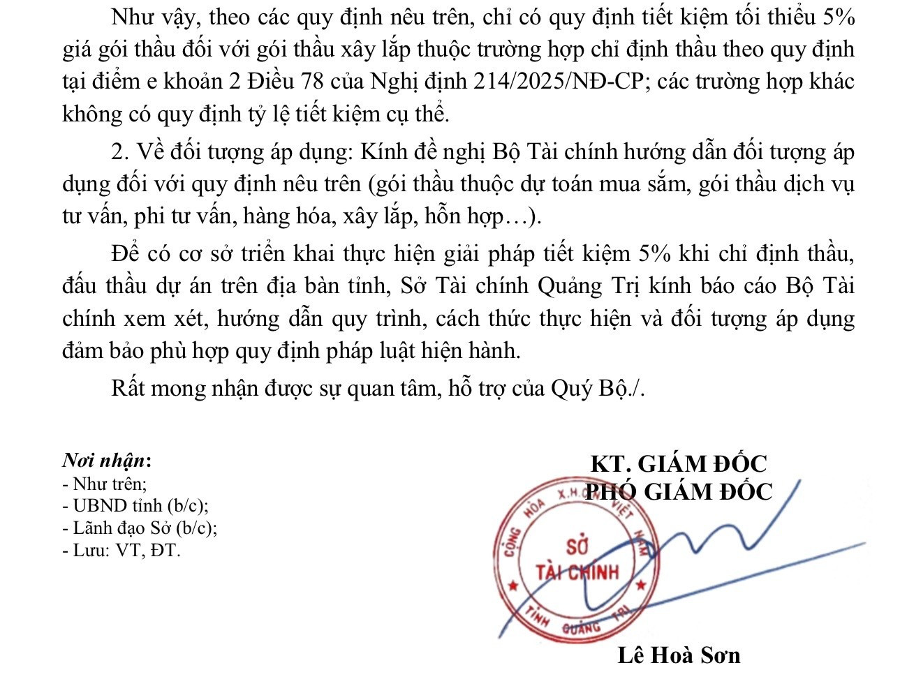 Sau khi công văn số 9886 của Văn phòng Chính phủ phát hành về tiết kiệm 5% trong đấu thầu, ngày 3/12/2025, Sở Tài chính tỉnh Quảng Ngãi đã có công văn hỏi Cục Quản lý đấu thầu (Bộ Tài chính) về cách thức thực hiện. Ngày 19/12/2025, Cục Quản lý đấu thầu có công văn trả lời, nội dung cũng tương tự như Bộ Tài chính trả lời một số địa phương.