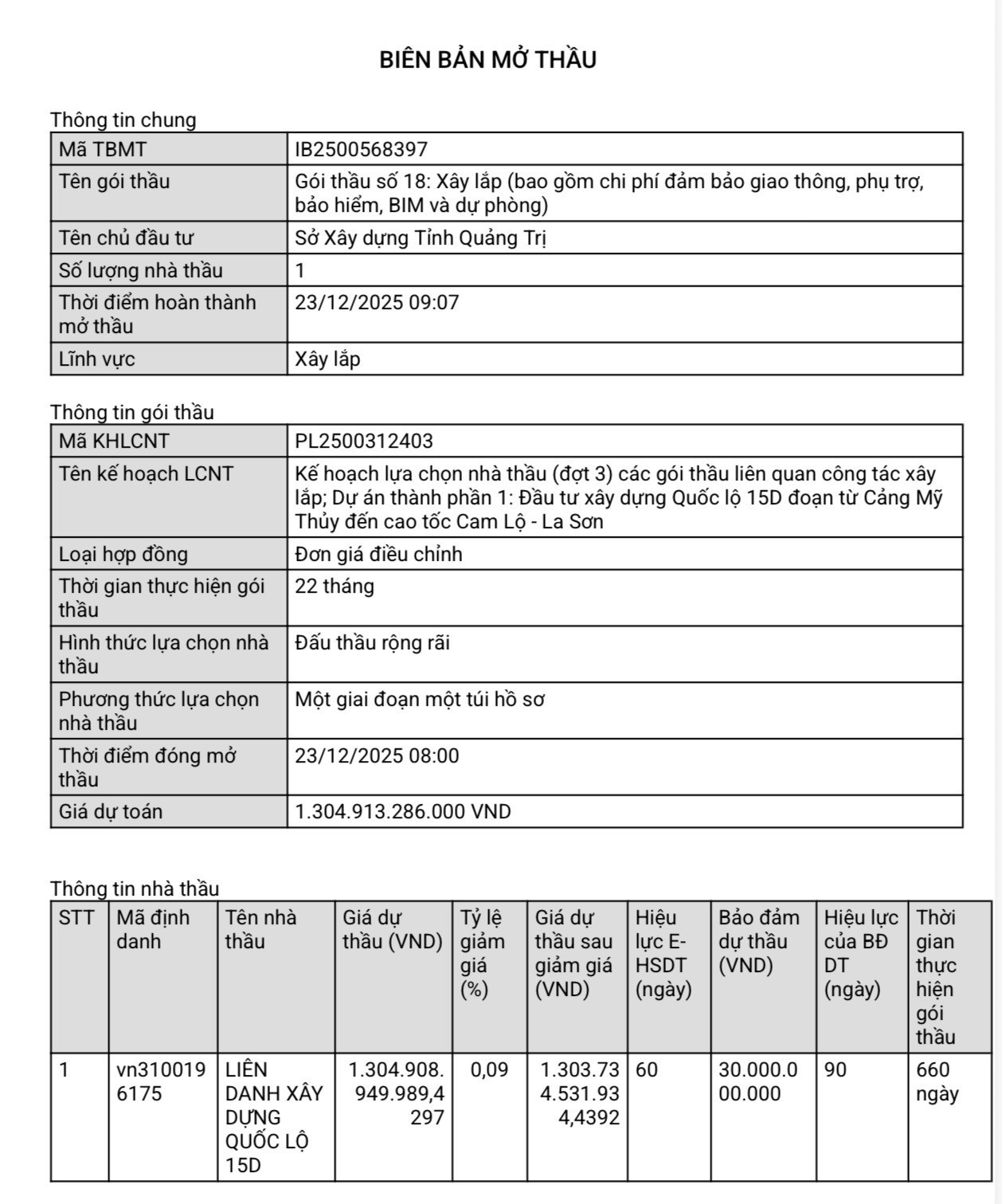 Đơn cử như Gói thầu Dự án thành phần 1: Đầu tư xây dựng Quốc lộ 15D đoạn từ cảng Mỹ Thuỷ đến cao tốc Cam Lộ - La Sơn, thời điểm đóng mở thầu là ngày 23/12/2025, có giá chào thầu là hơn 1.300 tỷ đồng. Liên danh xây dựng Quốc lộ 15D “một mình một ngựa”, chỉ giảm 0,09%.