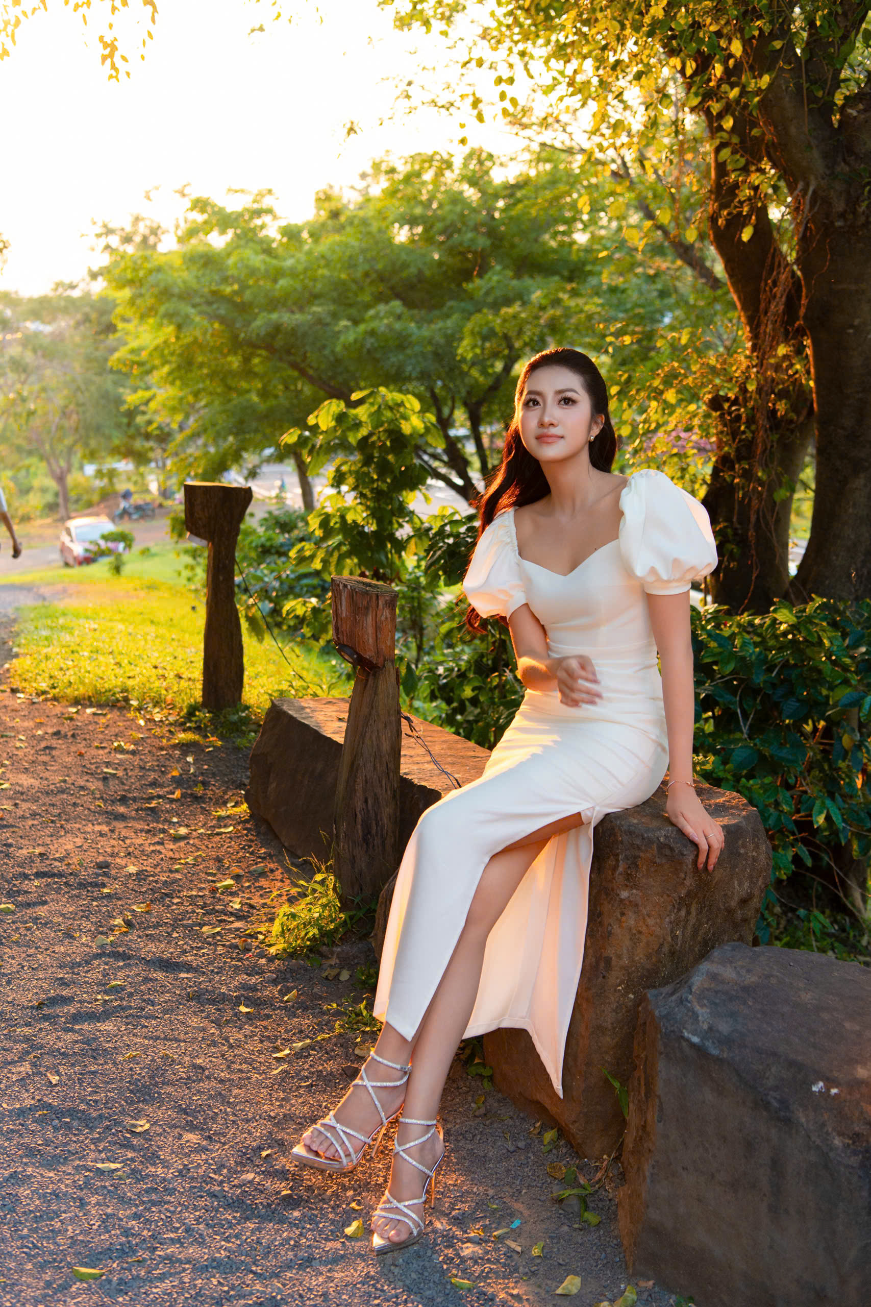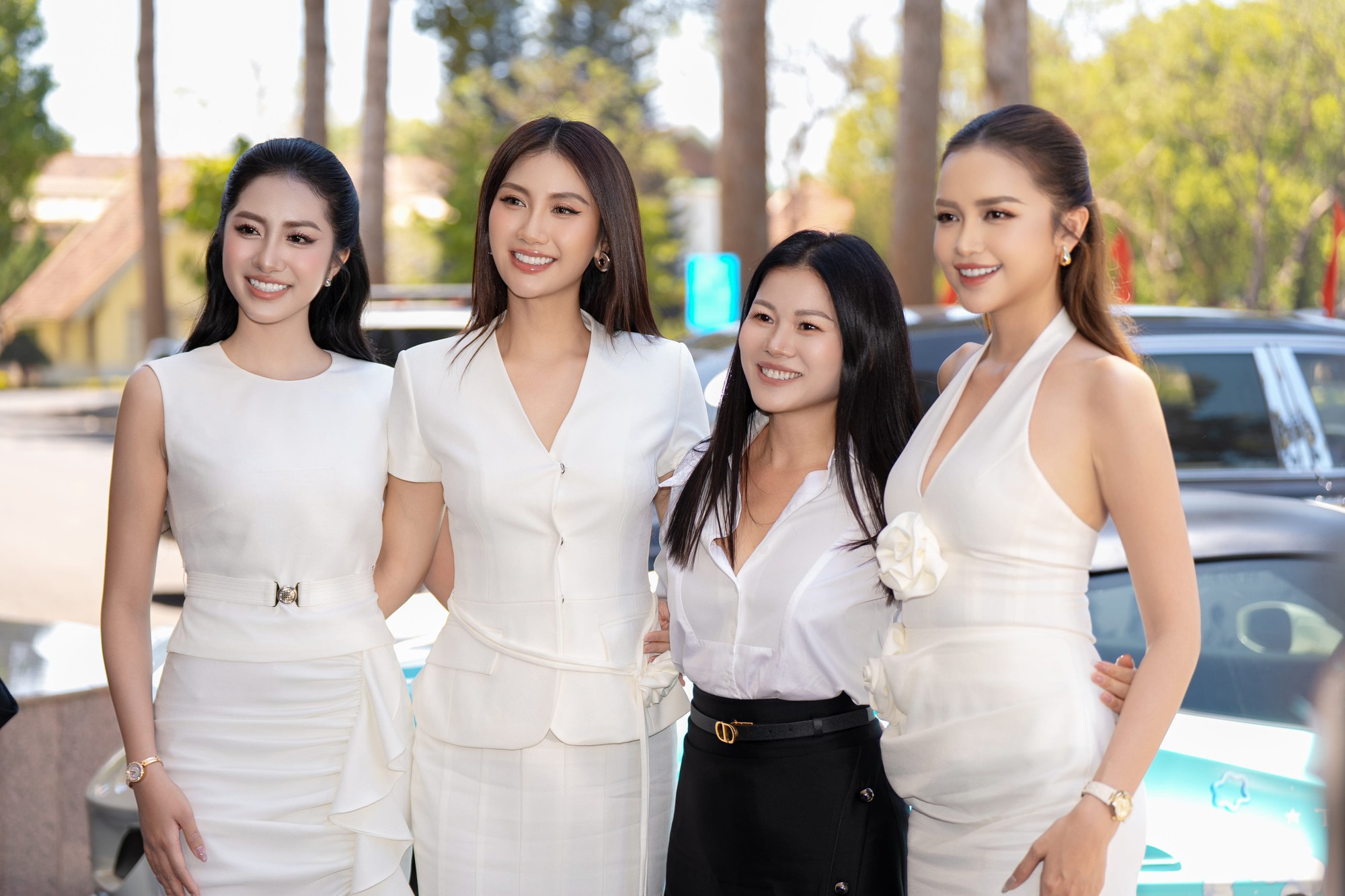 Cả ba cùng lựa chọn trang phục tông trắng thanh lịch do Helene Hoài sáng tạo, khi tham gia các hoạt động giao lưu với sinh viên, truyền thông và khán giả tại vùng đất Tây Nguyên. Đồng hành trong chuỗi sự kiện còn có Uyên Linh và giọng ca trẻ Izara Thiên Nga, cả hai cũng diện thiết kế của nữ nhà thiết kế.