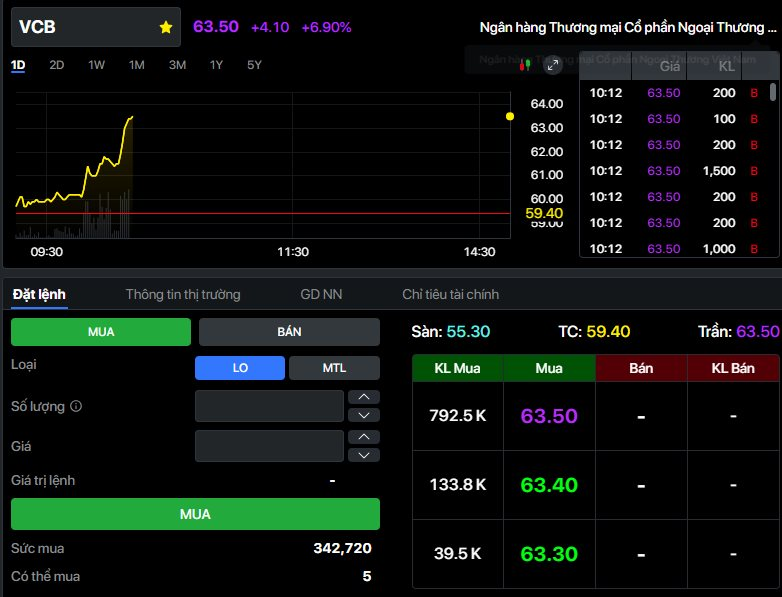 Phiên giao dịch buổi sáng 23/4 ghi nhận diễn biến đáng chú ý tại cổ phiếu VCB của Vietcombank khi lực cầu tăng mạnh kéo cổ phiếu này tím trần ngay đầu buổi sáng. Ghi nhận lúc 10h15, cổ phiếu VCB được giao dịch ở mức 63.500 đồng/cp, tăng 6,9% so với tham chiếu.