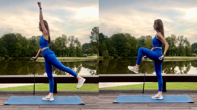 Cách thực hiện: Đứng trên một chân, dùng gậy golf chống cùng bên để hỗ trợ. Nâng chân còn lại sao cho đầu gối chạm khuỷu tay cùng bên. Thực hiện 10-12 lần mỗi bên.