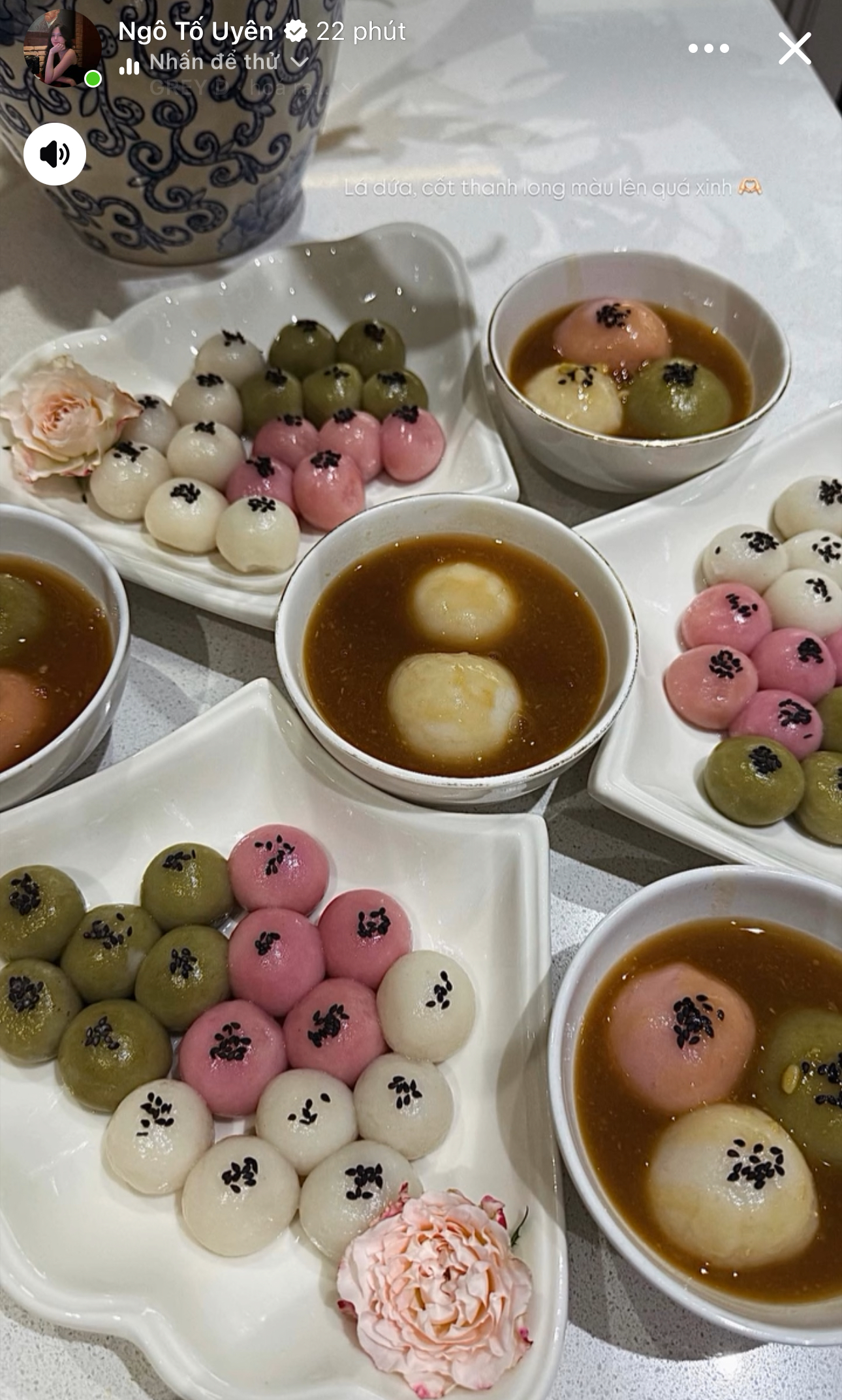 Trong khi đó, Ngô Tố Uyên – bà xã của trung vệ Nguyễn Thành Chung lại gây ấn tượng với mâm bánh trôi nhiều màu sắc bắt mắt. Những viên bánh trắng, hồng, xanh được nặn tròn đều, điểm xuyết mè đen và bày biện trên đĩa sứ tinh tế. Bên cạnh đó là các bát chè bánh trôi chan nước đường sóng sánh, tạo nên tổng thể vừa ngon mắt vừa đậm đà hương vị truyền thống.