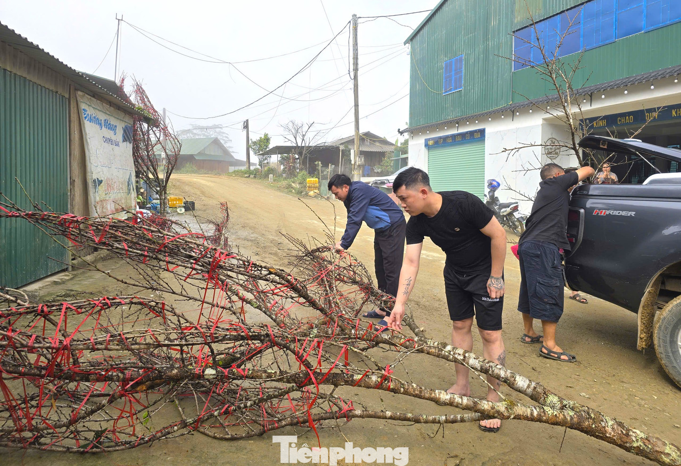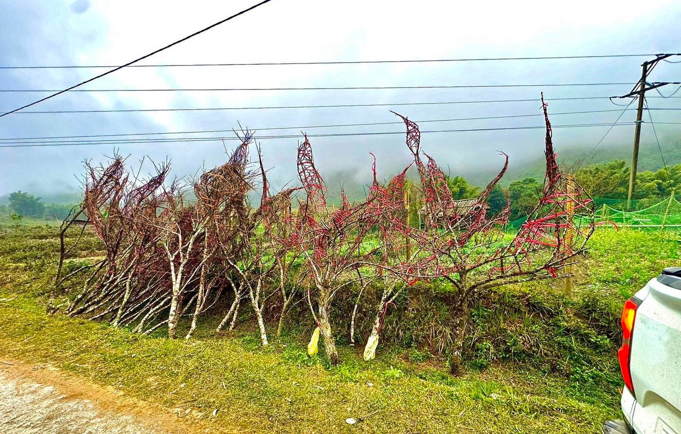 Những cành đào sau đó được vác từ trên núi xuống tập kết ven đường rồi đưa về miền xuôi bán Tết.