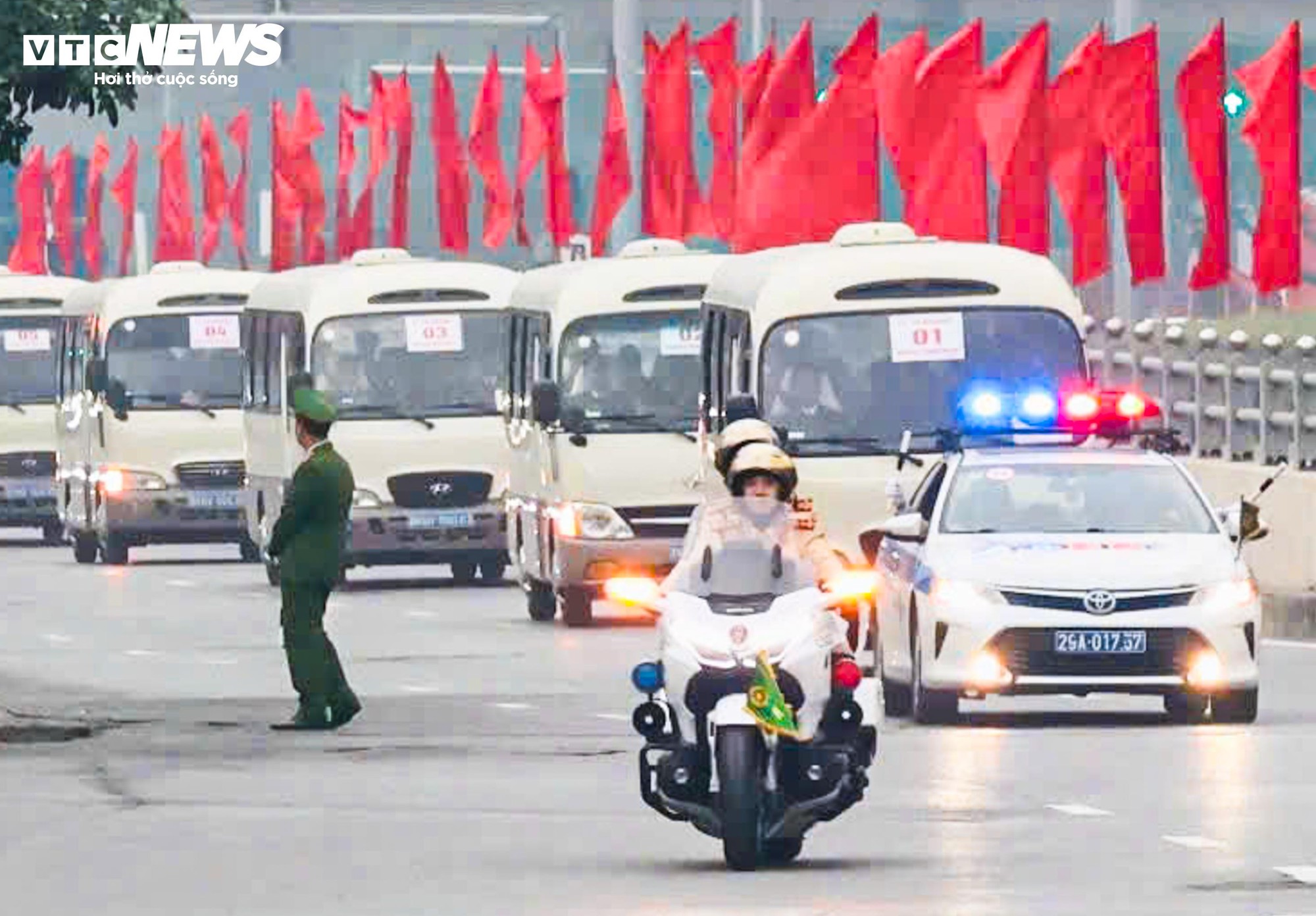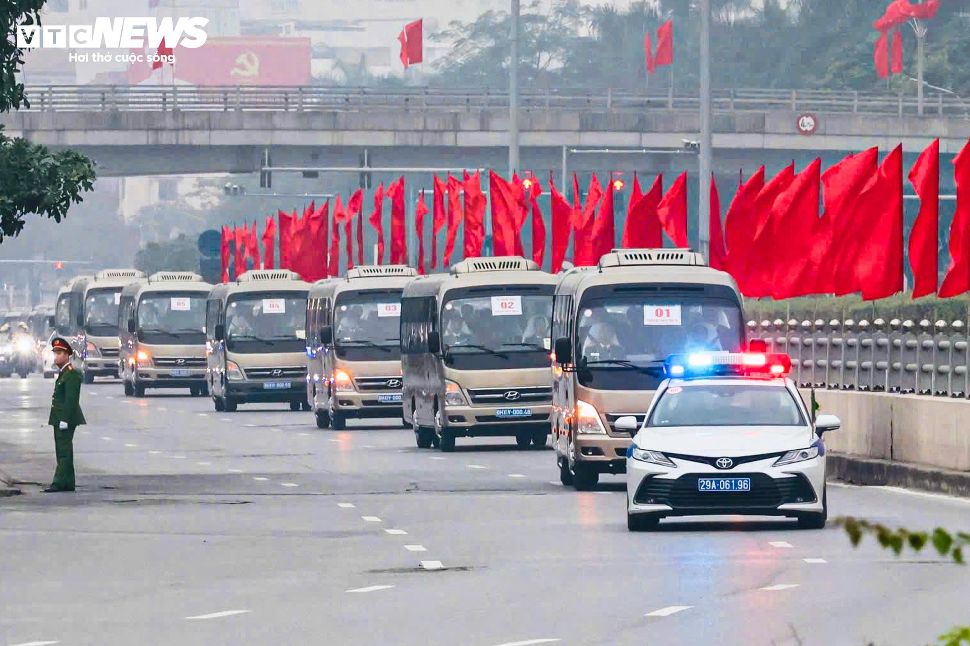 Sau Lễ viếng Chủ tịch Hồ Chí Minh, các đoàn đại biểu lên xe tiến về Trung tâm Hội nghị Quốc gia, nơi diễn ra phiên họp trù bị Đại hội lần thứ XIV của Đảng.