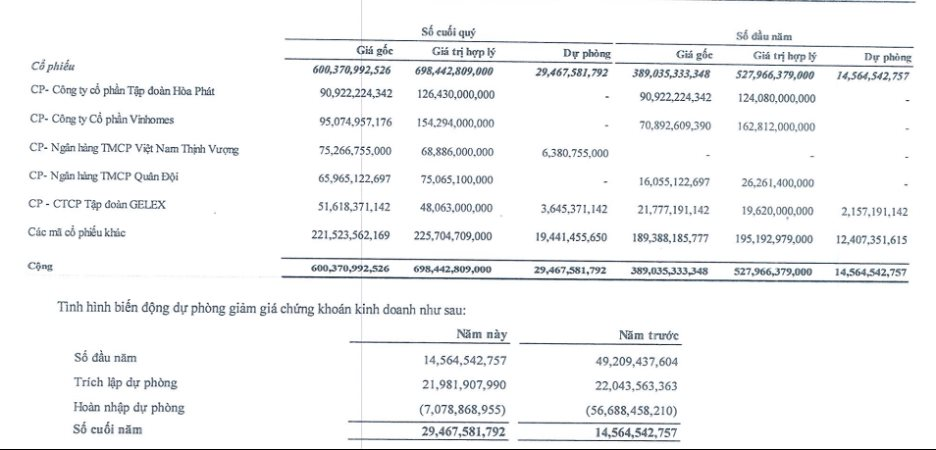 Giá trị hợp lý của các khoản chứng khoán kinh doanh tại cùng thời điểm cuối tháng 3 là gần 698 tỷ đồng, chủ yếu nhờ lãi lớn với cổ phiếu Hòa Phát (HPG), Vinhomes (VHM).