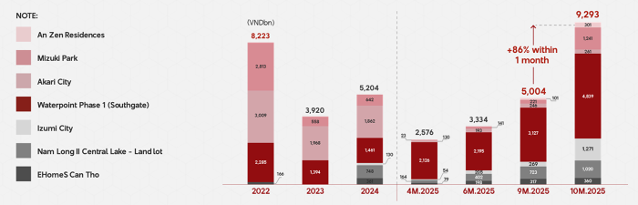 Đáng chú ý, chỉ riêng trong tháng 10, doanh số ghi nhận sự bứt phá mạnh mẽ khi đóng góp hơn 4.000 tỷ đồng, tương đương mức tăng trưởng 86% so với lũy kế 9 tháng đầu năm. Động lực chính đến từ việc khơi thông pháp lý và mở bán các phân khu mới tại các dự án trọng điểm như Waterpoint, Mizuki Park và Izumi City.