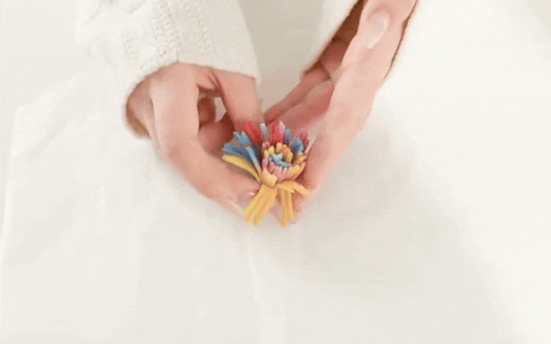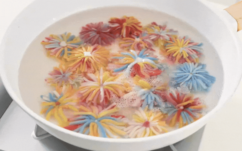 Cảm giác khi dán những dải bột màu sắc lại với nhau, rồi dùng dao cắt nhẹ thành những sợi mỏng, sau đó cuộn tròn lại và nhìn chúng "bung nở" ra như một đóa pháo hoa thực thụ là một trải nghiệm cực kỳ thư giãn. Nó giống như việc bạn đang cắm một lọ hoa hay vẽ một bức tranh vậy. Mỗi viên bánh trôi lúc này không cái nào giống cái nào, mỗi cái mang một dáng vẻ riêng, rực rỡ và sống động. Khi thả vào nồi nước sôi, những cánh "hoa bột" ấy bắt đầu chuyển mình, mềm mại và bắt mắt, tạo nên một cảnh tượng cực kỳ mãn nhãn ngay trong gian bếp nhỏ.
