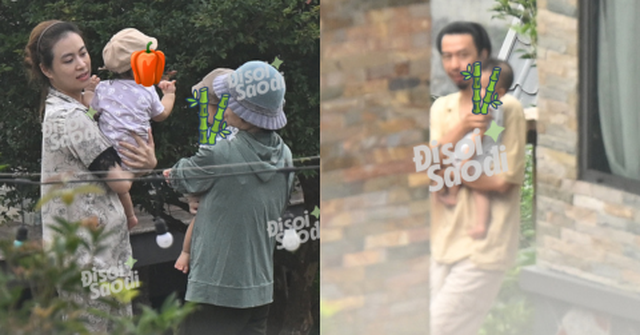Nữ ca sĩ diện trang phục ở nhà, tóc buộc gọn và cùng người nhà bế con dạo xung quanh khuôn viên nhà
