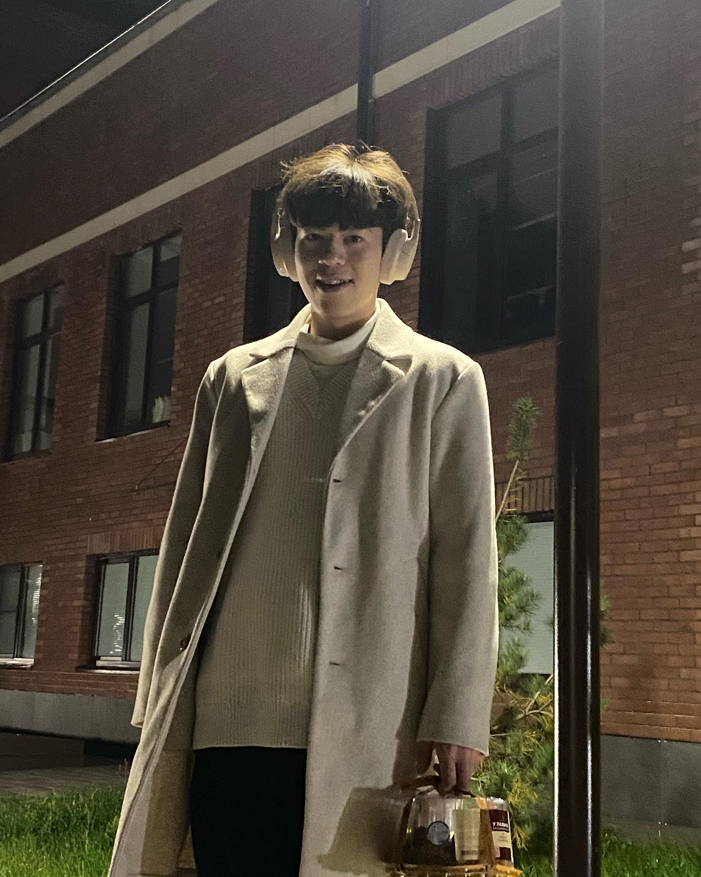 Đứng dưới đèn vàng, mặc áo khoác sáng màu, tai nghe trùm tai, tay xách túi nhỏ như đã chuẩn bị sẵn quà - một vibe kiểu bạn trai chờ người yêu của Lê Viktor.