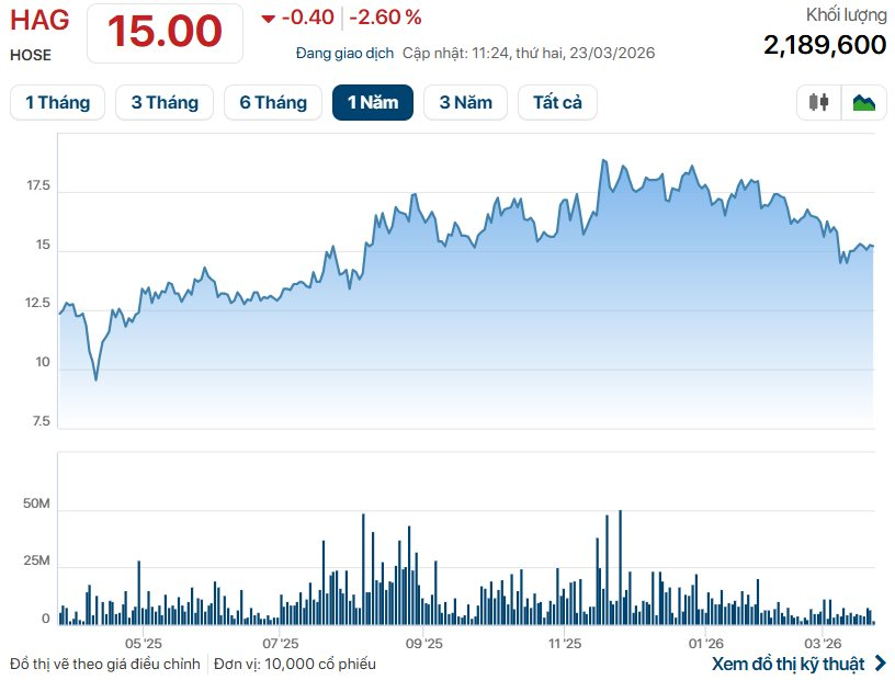 Động thái liên tiếp gia tăng tỷ lệ của lãnh đạo diễn ra trong bối cảnh cổ phiếu HAG điều chỉnh theo xu hướng chung của thị trường. Kết phiên sáng 23/3, thị giá lùi về 14.950 đồng/cổ phiếu, thấp hơn khoảng 20% so với vùng đỉnh gần nhất. Tạm tính theo mức giá này, số tiền mà ông Đức dự kiến chi ra để hoàn tất giao dịch vào khoảng 60 tỷ đồng.