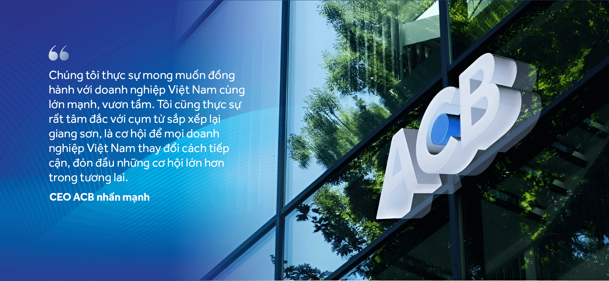 "Chúng tôi thực sự mong muốn đồng hành với doanh nghiệp Việt Nam cùng lớn mạnh, vươn tầm. Tôi cũng thực sự rất tâm đắc với cụm từ sắp xếp lại giang sơn, là cơ hội để mọi doanh nghiệp Việt Nam thay đổi cách tiếp cận, đón đầu những cơ hội lớn hơn trong tương lai", CEO ACB nhấn mạnh.