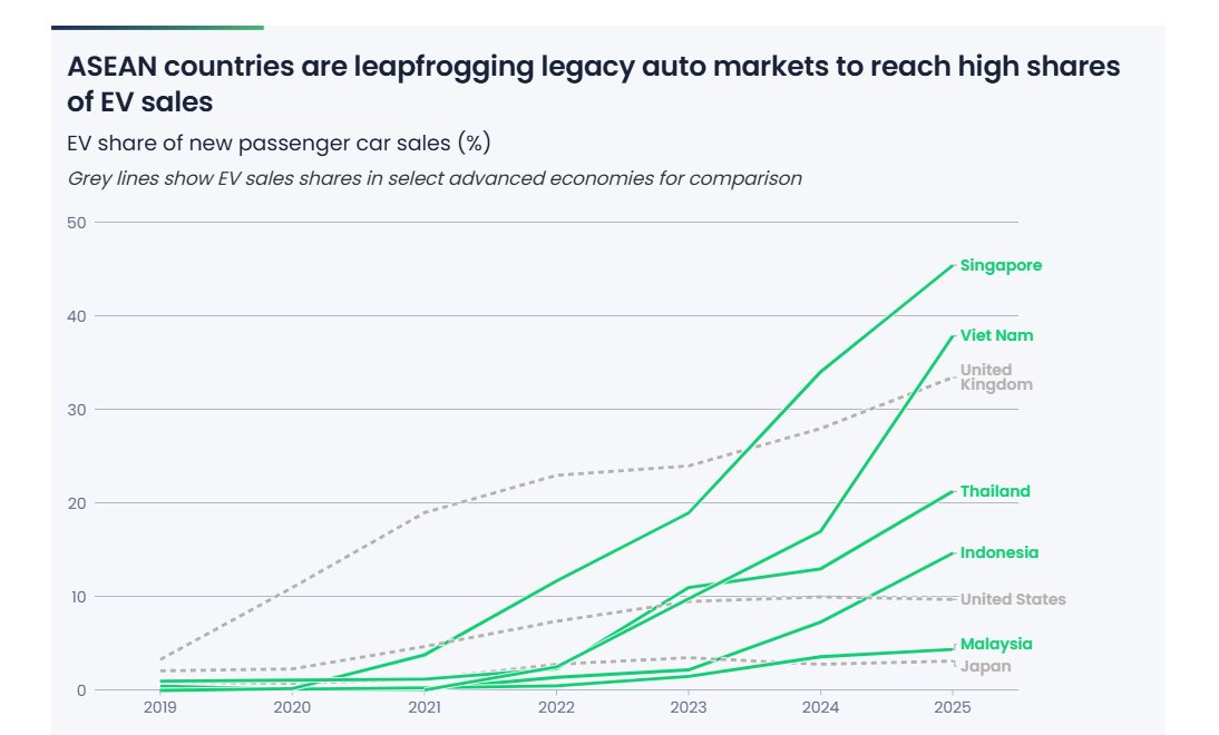 Báo cáo mới nhất từ Ember cho thấy các quốc gia ASEAN đang dẫn đầu về tốc độ chuyển đổi xe điện, vượt qua nhiều thị trường phát triển như Mỹ và châu Âu.