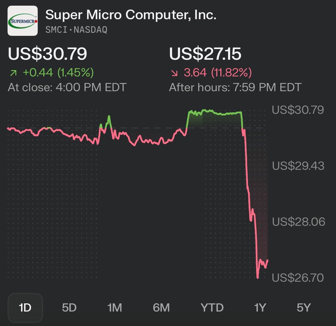 Ngay sau khi lệnh bắt giữ được công bố, cổ phiếu SMCI đã bốc hơi 12% trong phiên giao dịch ngoài giờ.