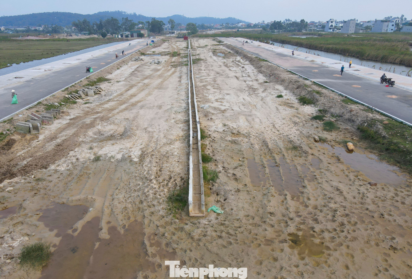Tại nút giao với đường ven biển Sầm Sơn, đơn vị thi công đổ vật liệu ngổn ngang suốt thời gian dài. Các phương tiện phải đi vòng ra bên ngoài để lưu thông qua đây.