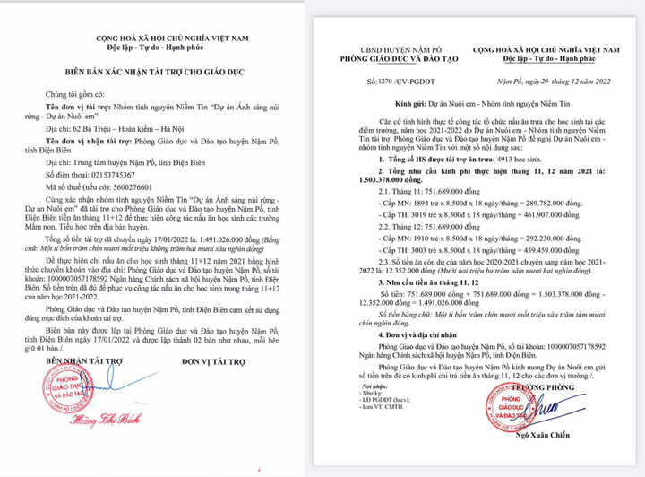 Hai văn bản được bổ sung lần này gồm biên bản xác nhận của Phòng GD&ĐT huyện Nậm Pồ sau khi đã nhận đủ số tiền theo hai giao dịch và công văn đề nghị hỗ trợ tiền nuôi em (cơ sở thực hiện việc chuyển tiền).