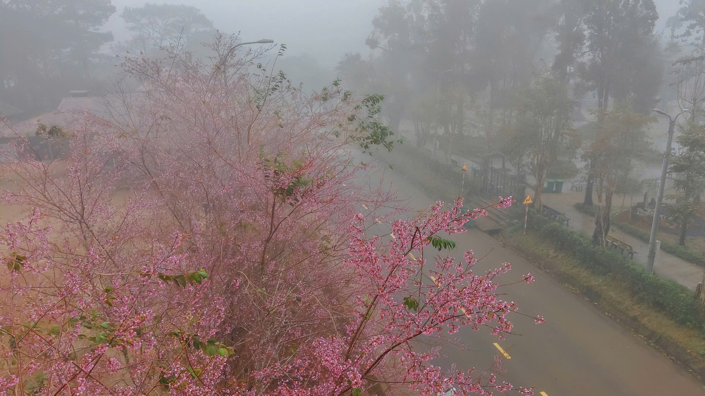 Hoa anh đào nở rực hồng kèm sương mờ tạo nên sức hút khó quên cho Măng Đen.
