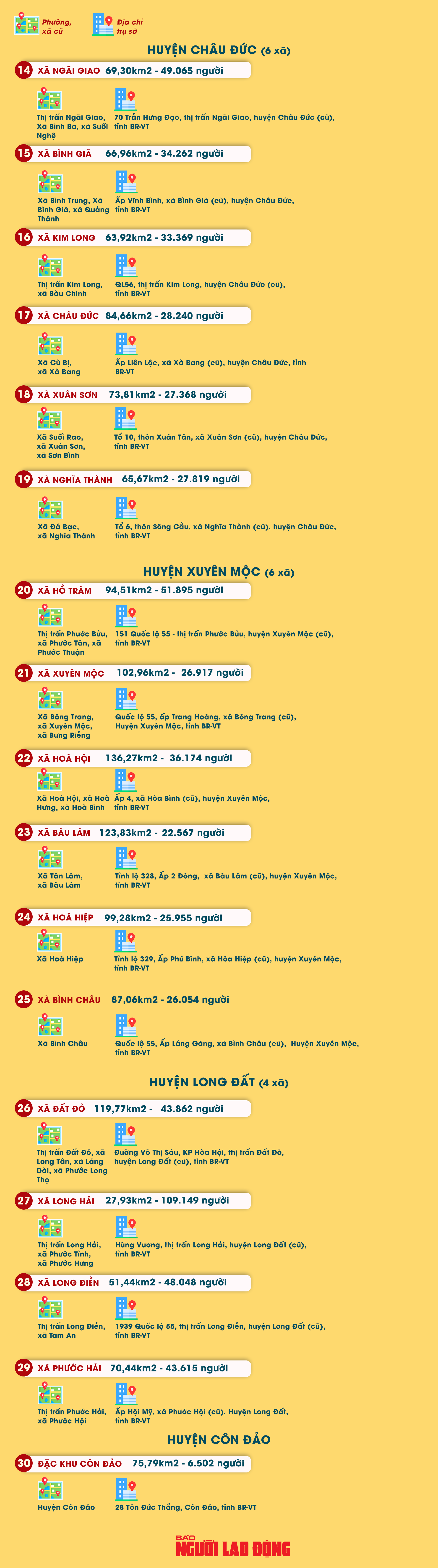 + Các xã, đặc khu dự kiến thành lập mới tại Huyện Châu Đức, Xuyên Mộc, Long Đất, Côn Đảo (Tỉnh Bà Rịa - Vũng Tàu):
