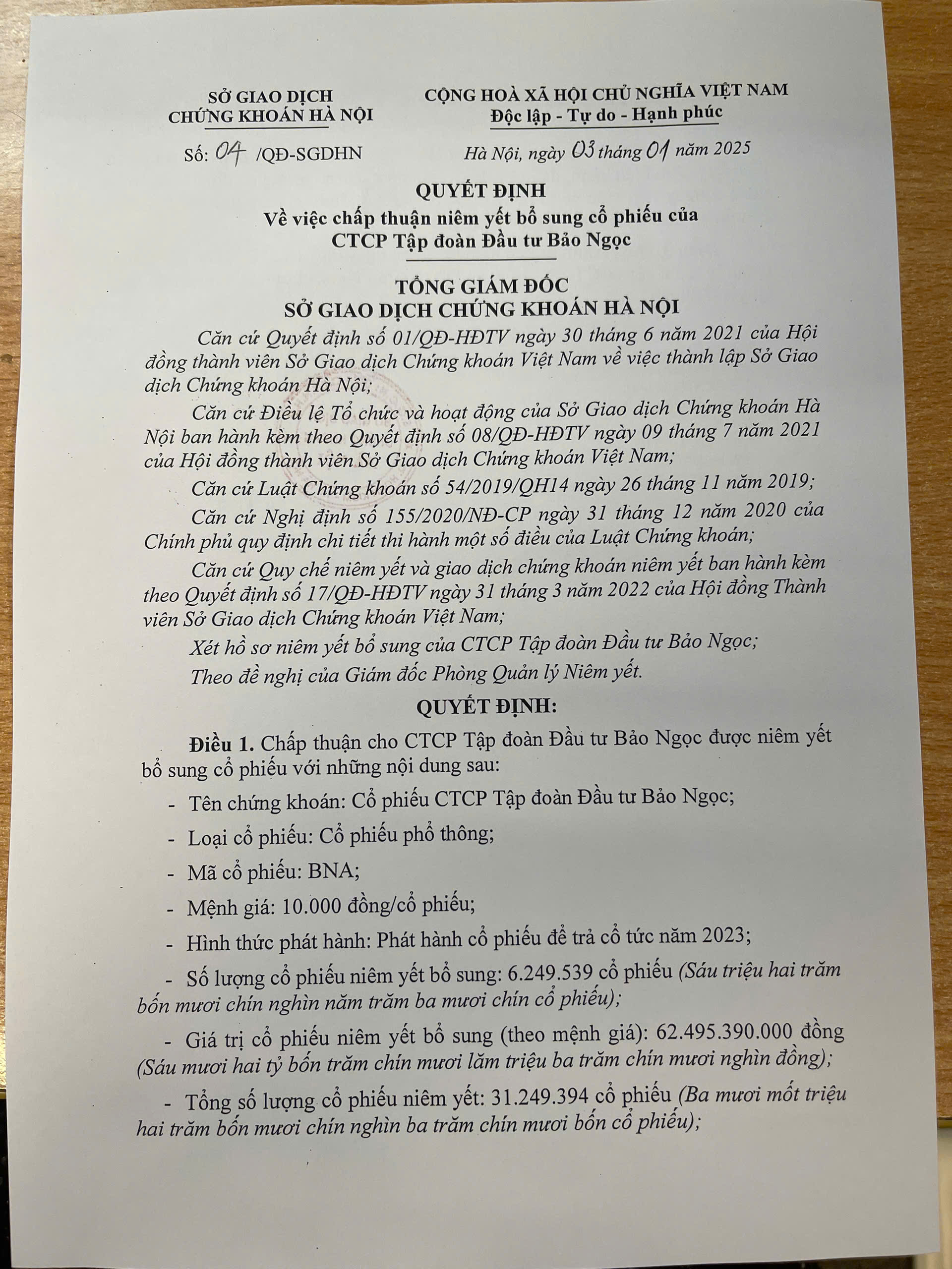BNA: Niêm yết 6.249.539 cổ phiếu trả cổ tức năm 2023