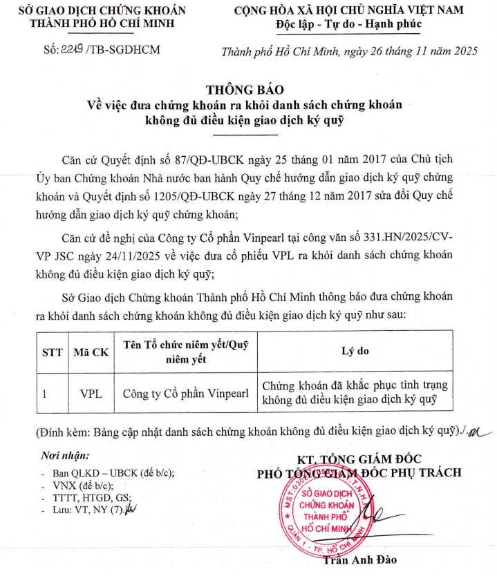 | Lý do: | Chứng khoán đã khắc phục tình trạng không đủ điều kiện giao dịch ký quỹ. |