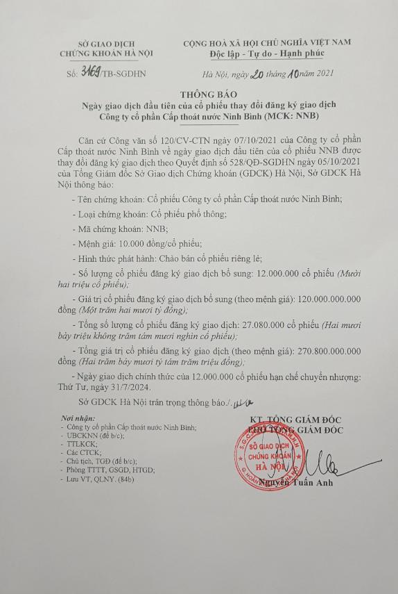 NNB: Ngày 31/07/2024, giao dịch 12.000.000 cổ phiếu ĐKGD bổ sung