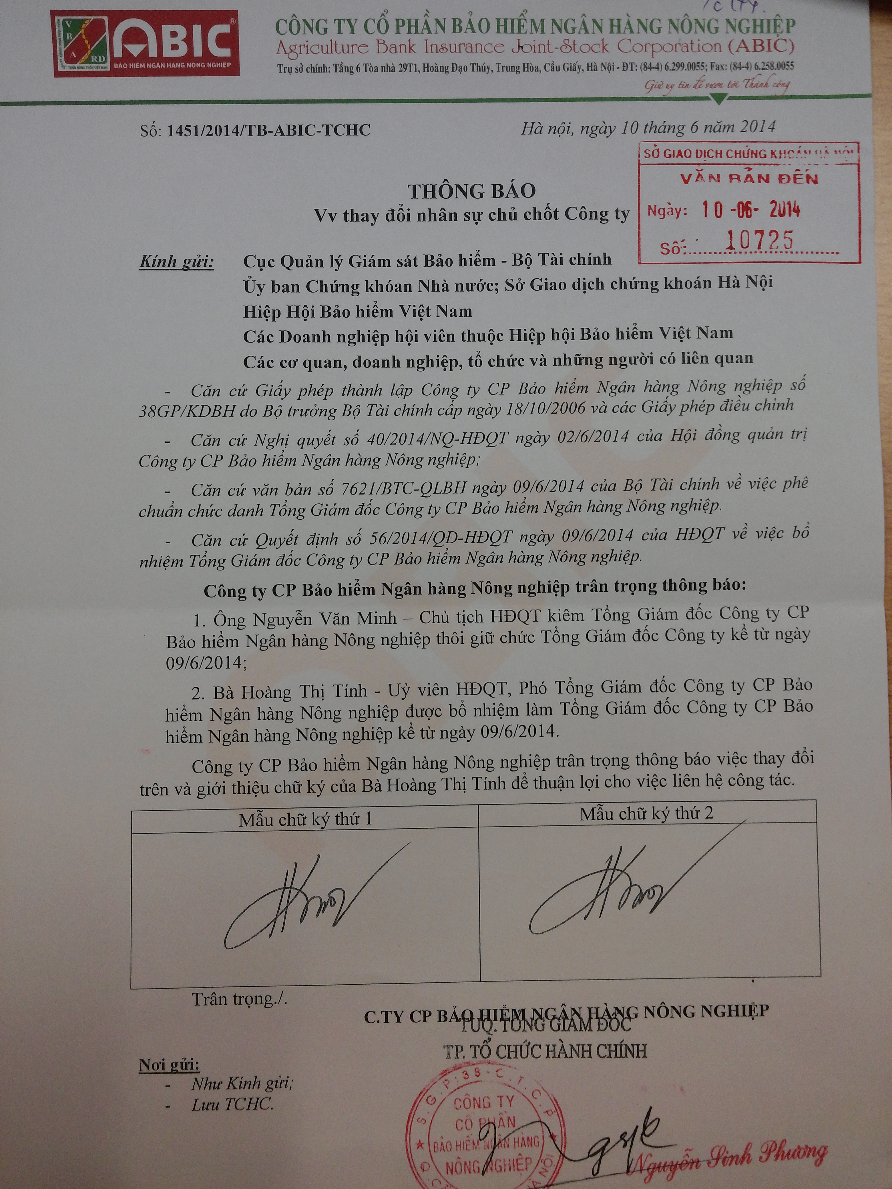 ABI: Bà Hoàng Thị Tính làm TGĐ từ 9.6.2014