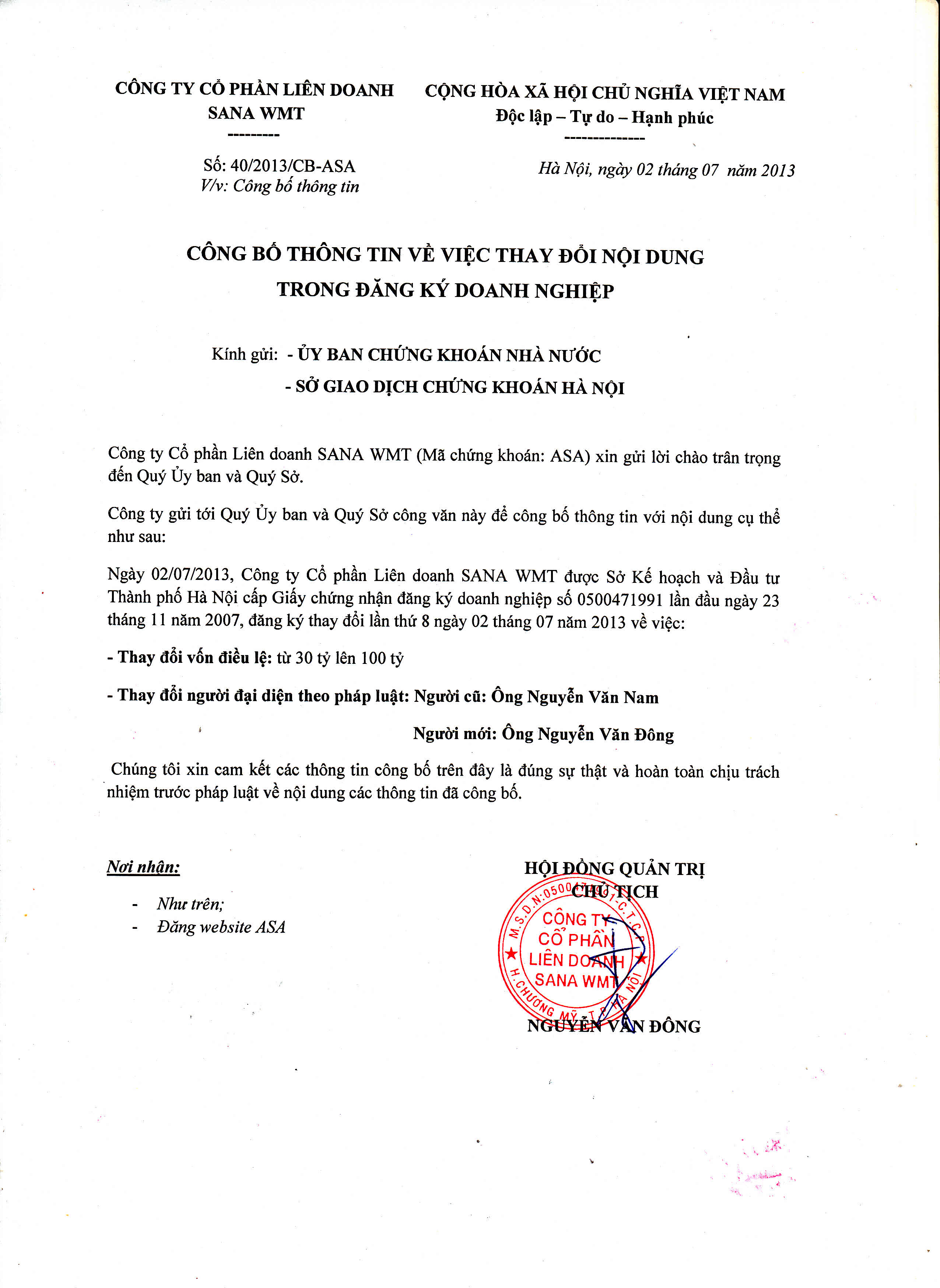 ASA: Thay đổi nội dung Giấy chứng nhận đăng ký doanh nghiệp