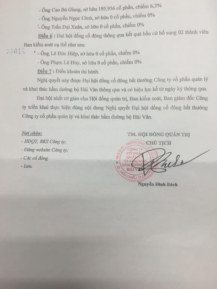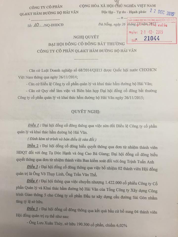 HHV: Nghị quyết ĐHĐCĐ bất thường năm 2015