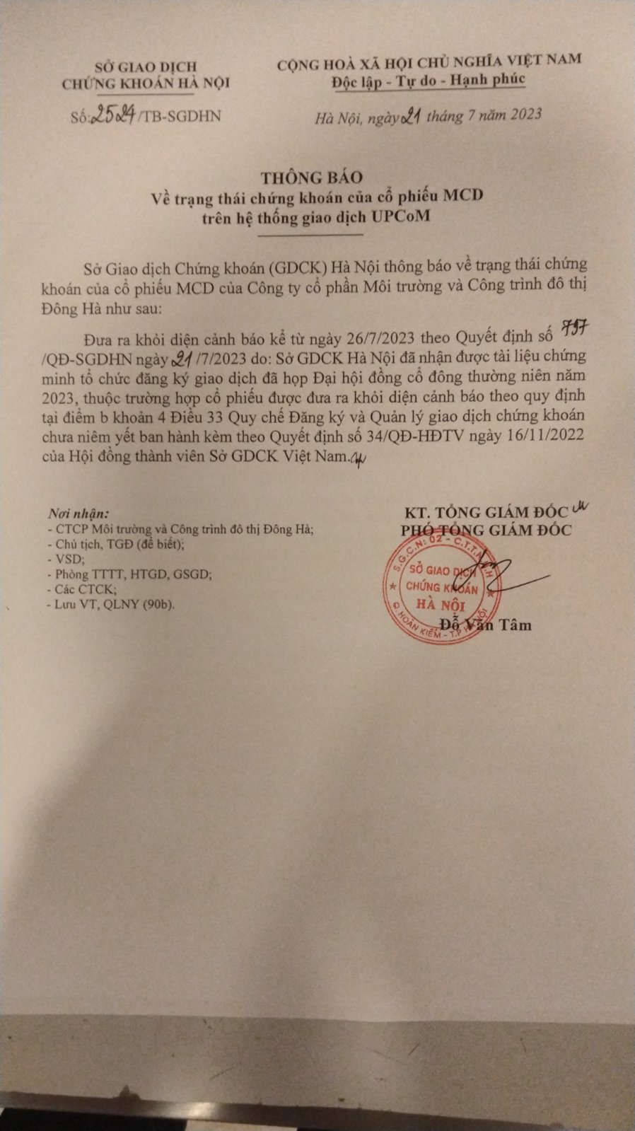 Thông báo về trạng thái chứng khoán của cổ phiếu MCD trên hệ thống giao dịch UPCoM