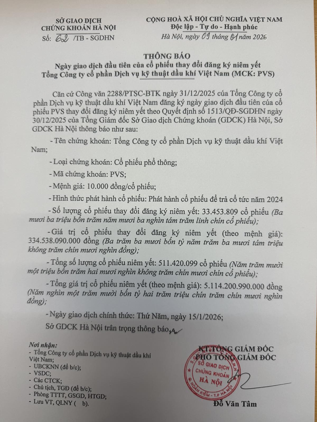 PVS: 15.1.2026, giao dịch 33.453.809 cp trả cổ tức năm 2024