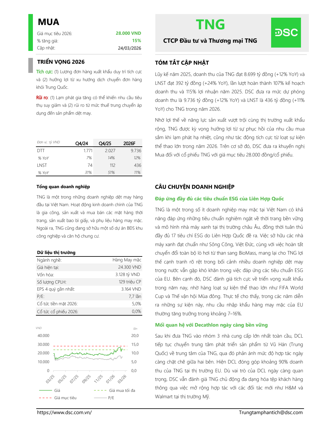Nhờ lợi thế về năng lực sản xuất vượt trội cùng thị trường xuất khẩu rộng, TNG được kỳ vọng hưởng lợi từ sự phục hồi của nhu cầu mua sắm khi lạm phát hạ nhiệt, cũng như tác động tích cực từ loạt sự kiện thể thao lớn trong năm 2026. Trên cơ sở đó, DSC đưa ra khuyến nghị Mua đối với cổ phiếu TNG với giá mục tiêu 28.000 đồng/cổ phiếu.