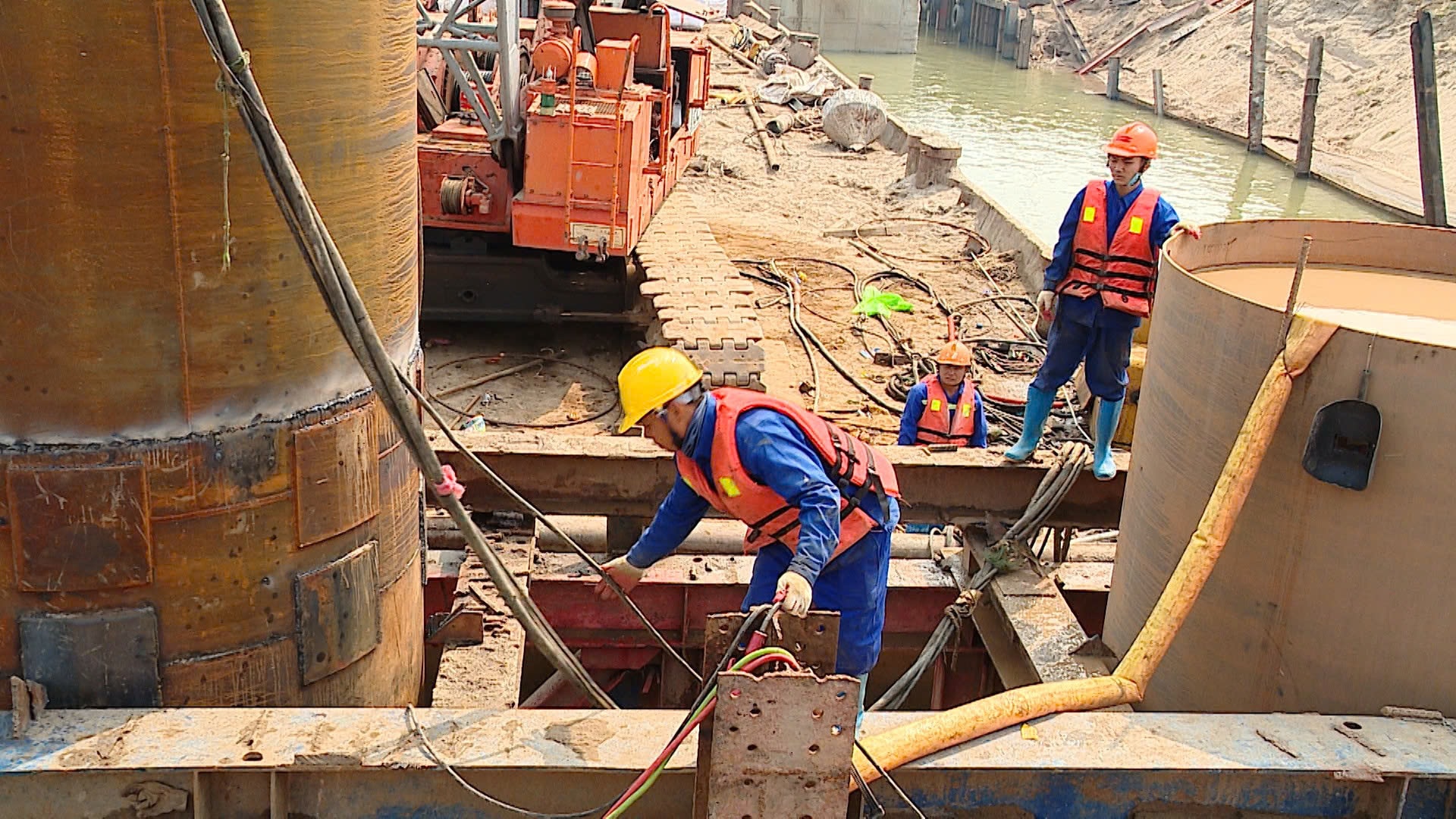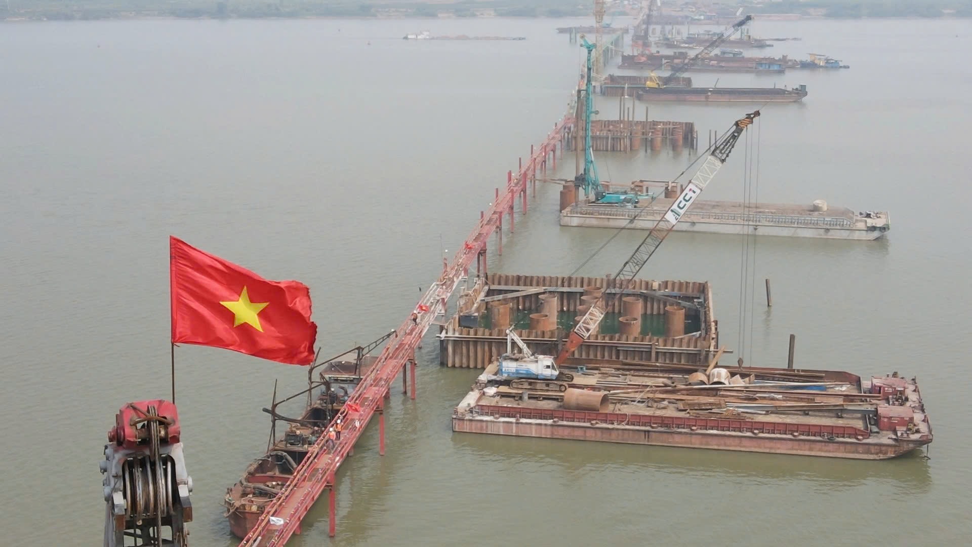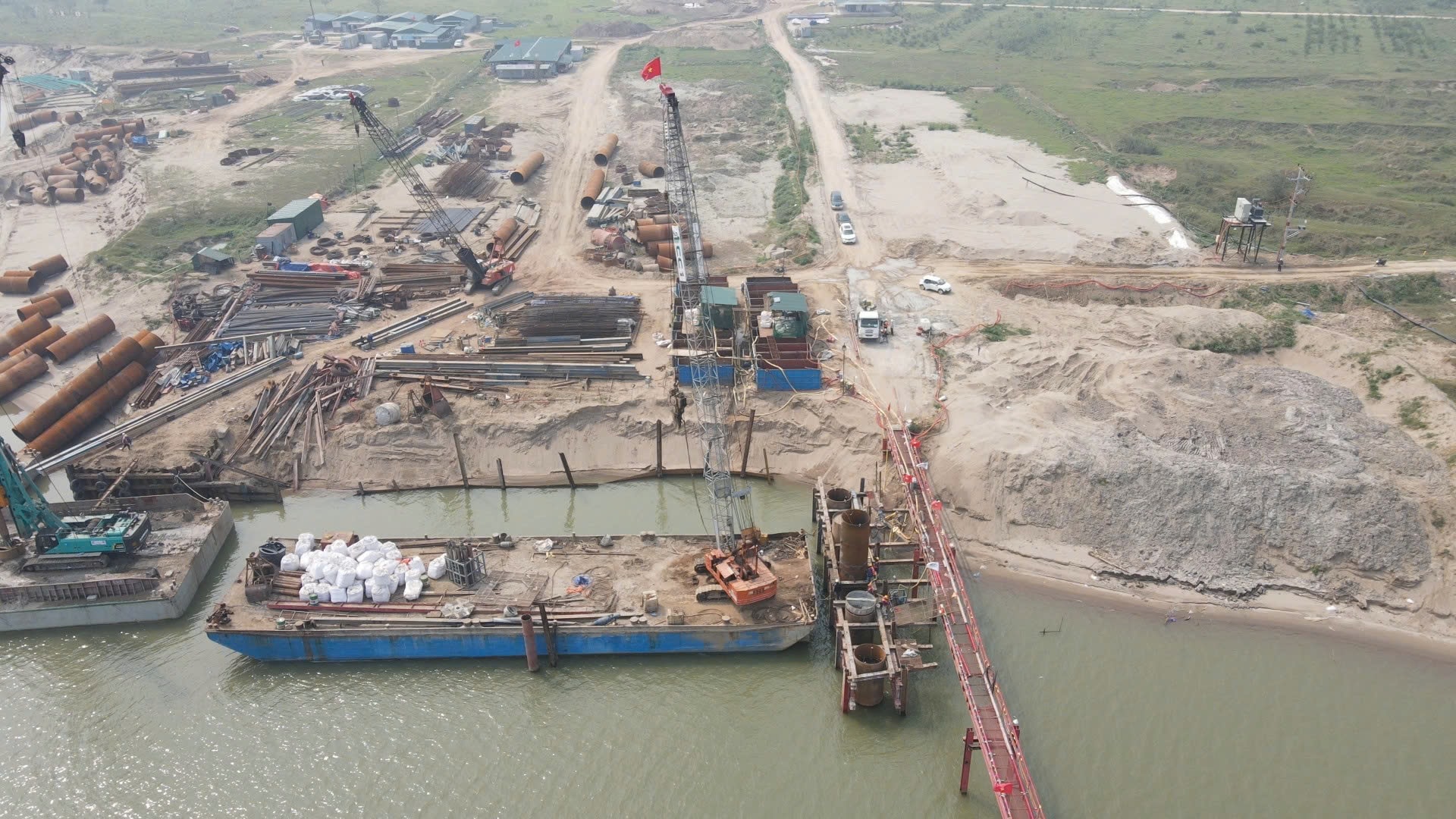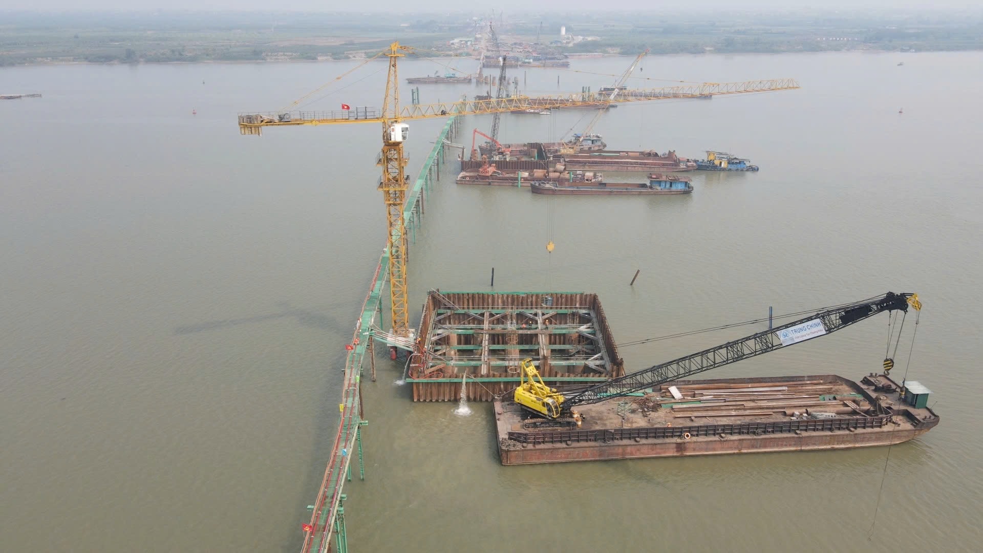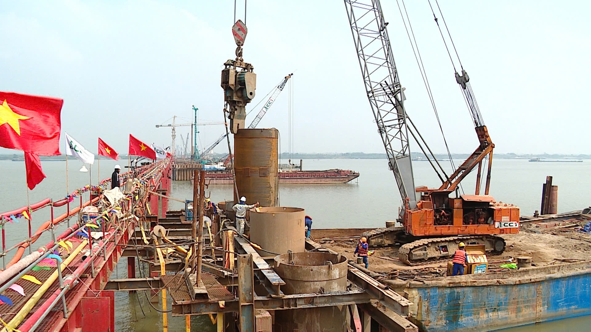 Không khí thi công sôi động trên công trường dự án cầu Hồng Hà.