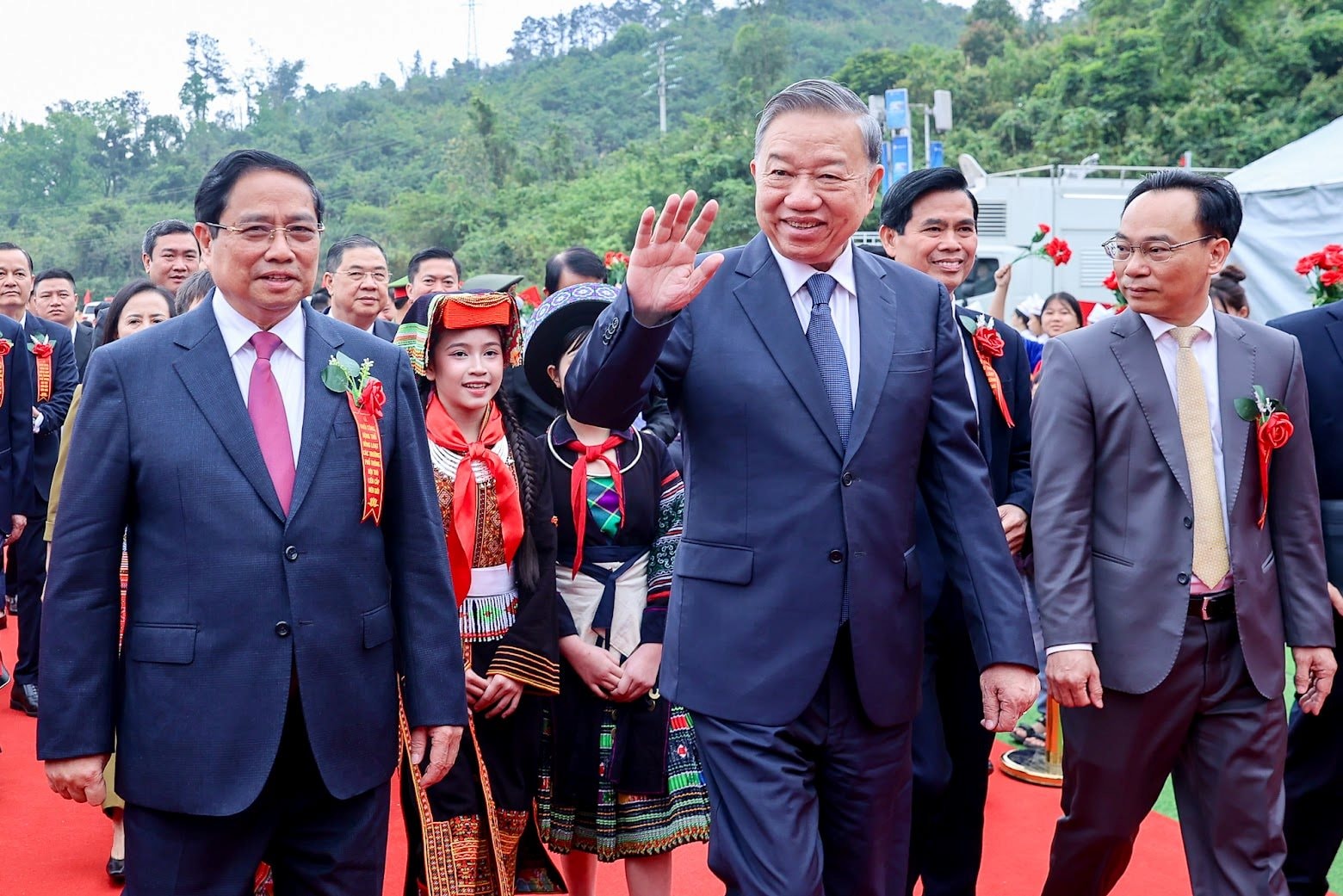 Tổng Bí thư Tô Lâm, Thủ tướng Phạm Minh Chính tới dự lễ khởi công tại điểm cầu chính, Trường phổ thông nội trú tiểu học và trung học cơ sở Đồng Đăng, xã Đồng Đăng, tỉnh Lạng Sơn. Ảnh: VGP