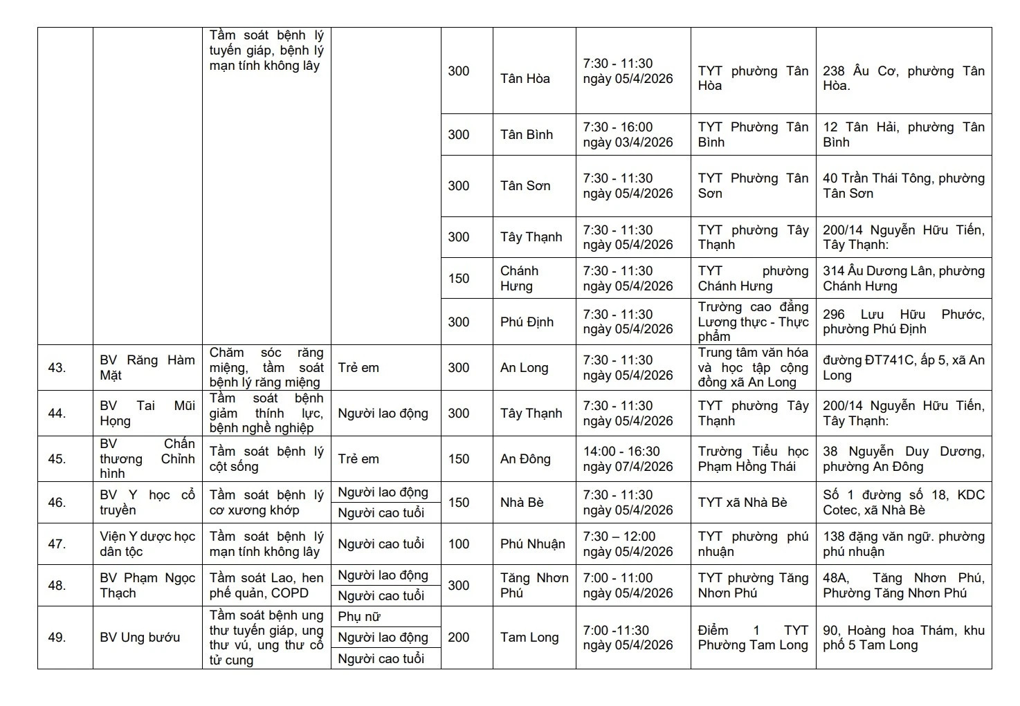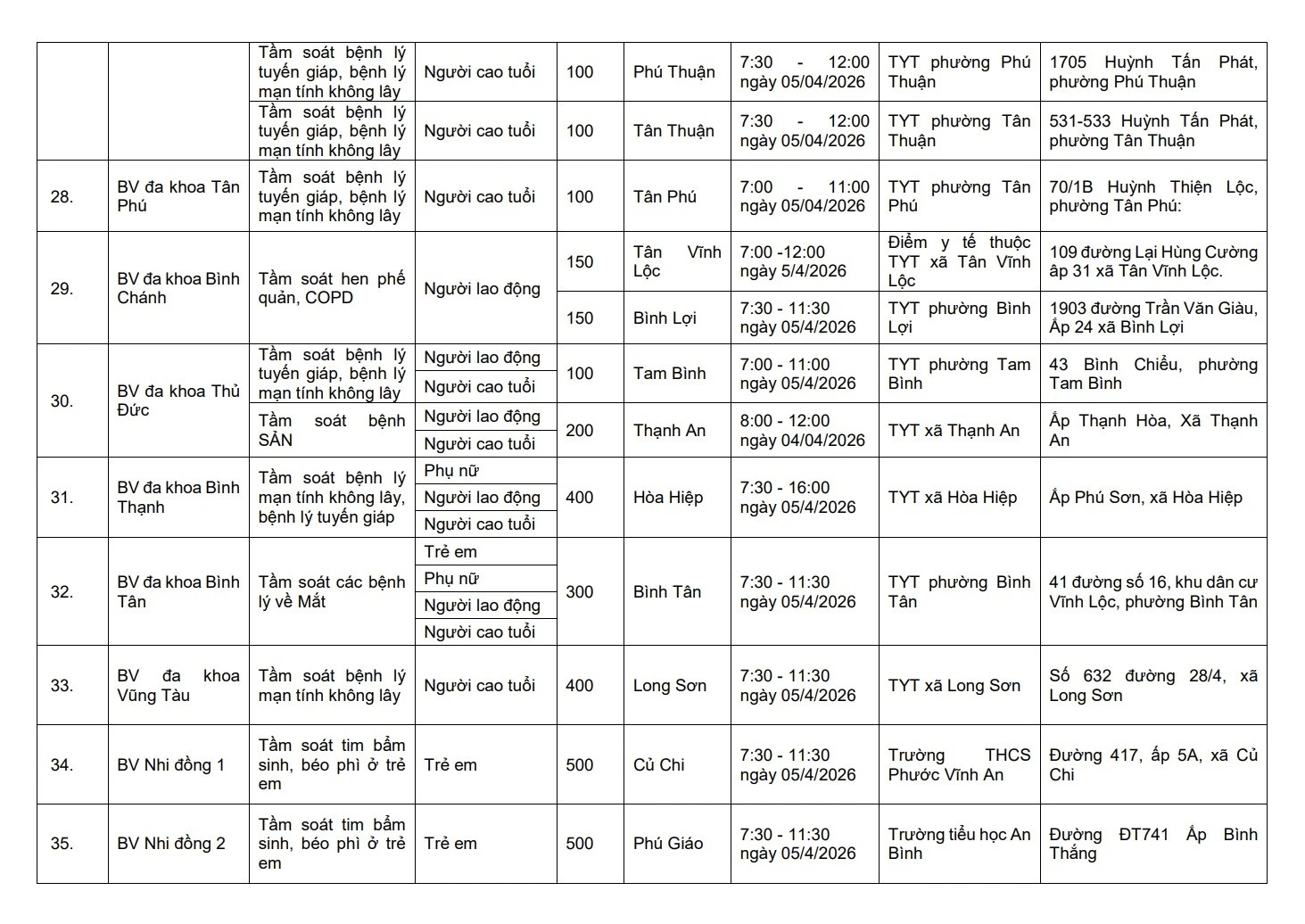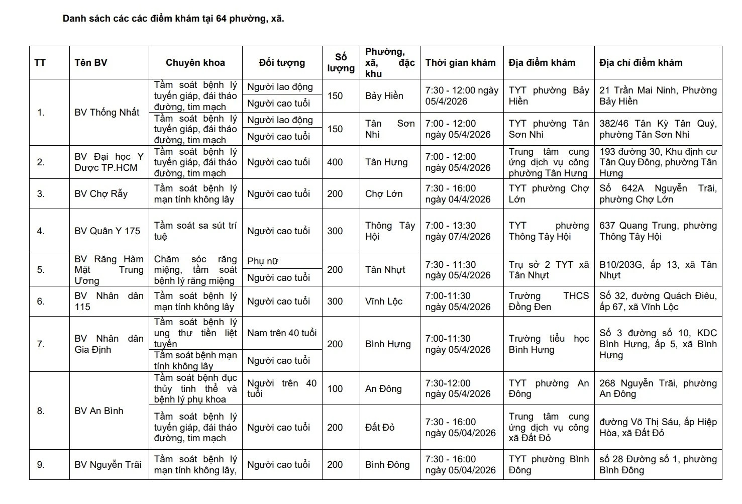 Tổng cộng 58 bệnh viện đa khoa, chuyên khoa và trung tâm y tế tại TP.HCM sẽ tổ chức khám tại 64 phường, xã, ưu tiên các khu vực xa trung tâm nhằm giúp người dân dễ dàng tiếp cận dịch vụ y tế chất lượng ngay tại nơi cư trú.