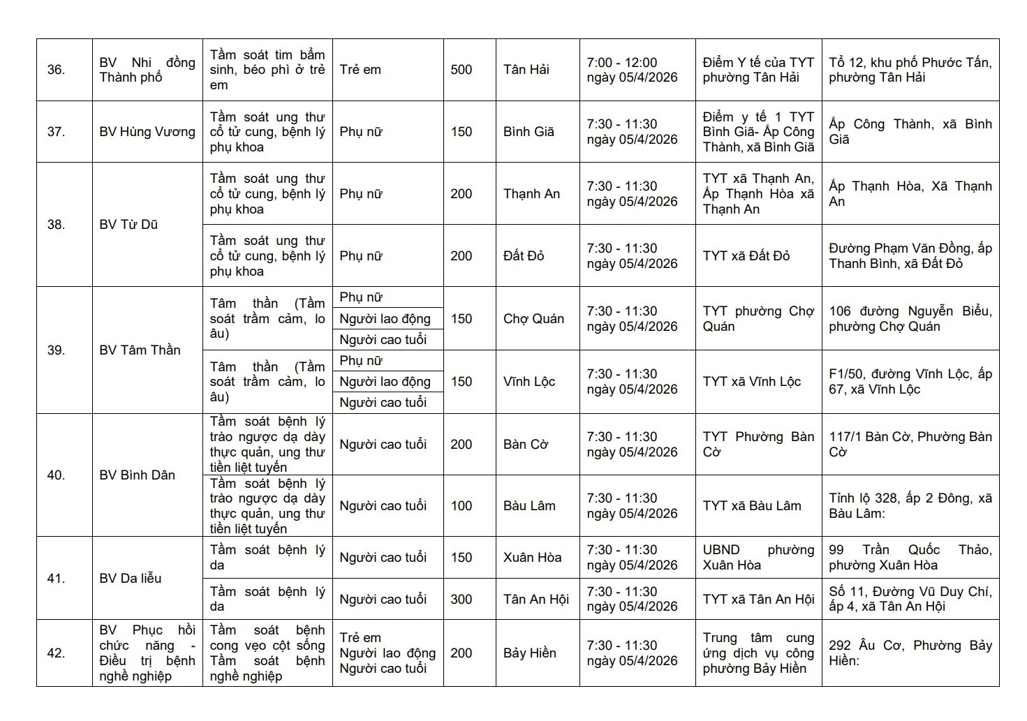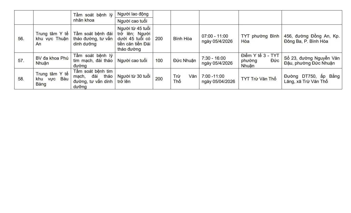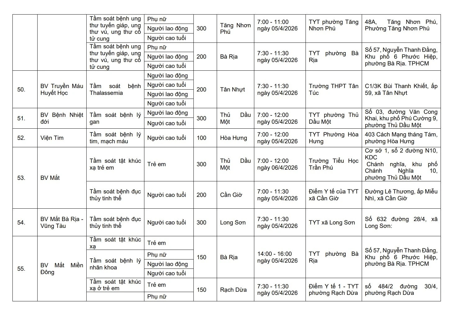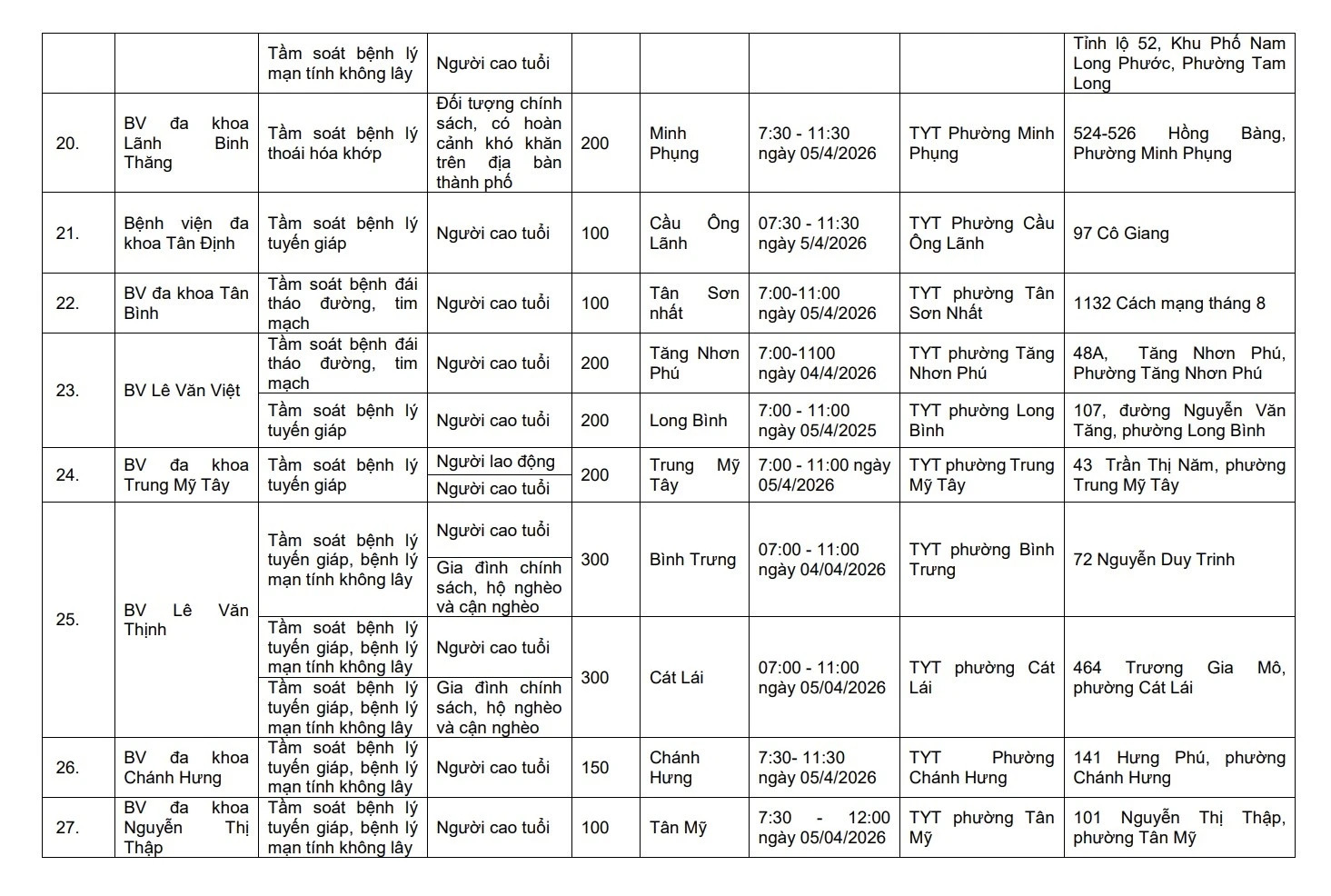 Tổng cộng 58 bệnh viện đa khoa, chuyên khoa và trung tâm y tế tại TP.HCM sẽ tổ chức khám tại 64 phường, xã, ưu tiên các khu vực xa trung tâm nhằm giúp người dân dễ dàng tiếp cận dịch vụ y tế chất lượng ngay tại nơi cư trú.