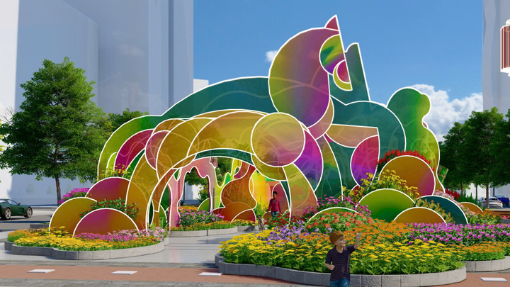Trong khi đó, lấy cảm hứng từ bản dân ca Lý ngựa ô, cụm đại cảnh “Lý ngựa ô” tái hiện nét văn hóa Nam Bộ với tạo hình vui nhộn. Điểm đặc biệt là bề mặt linh vật được hiệu ứng sơn mài với hoa văn mây sóng 3D hologram, tạo nên sự óng ánh, bắt mắt dưới ánh nắng mặt trời.