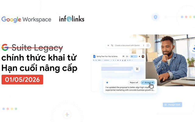 Đại diện từ Infolinks cho biết đơn vị hiện đang triển khai chương trình hỗ trợ nâng cấp từ G Suite legacy sang Google Workspace với mức ưu đãi chi phí lên đến 60% cho các doanh nghiệp thực hiện chuyển đổi trước tháng 5/2026. Mức ưu đãi cụ thể có thể thay đổi tùy theo quy mô và gói dịch vụ mà doanh nghiệp lựa chọn.