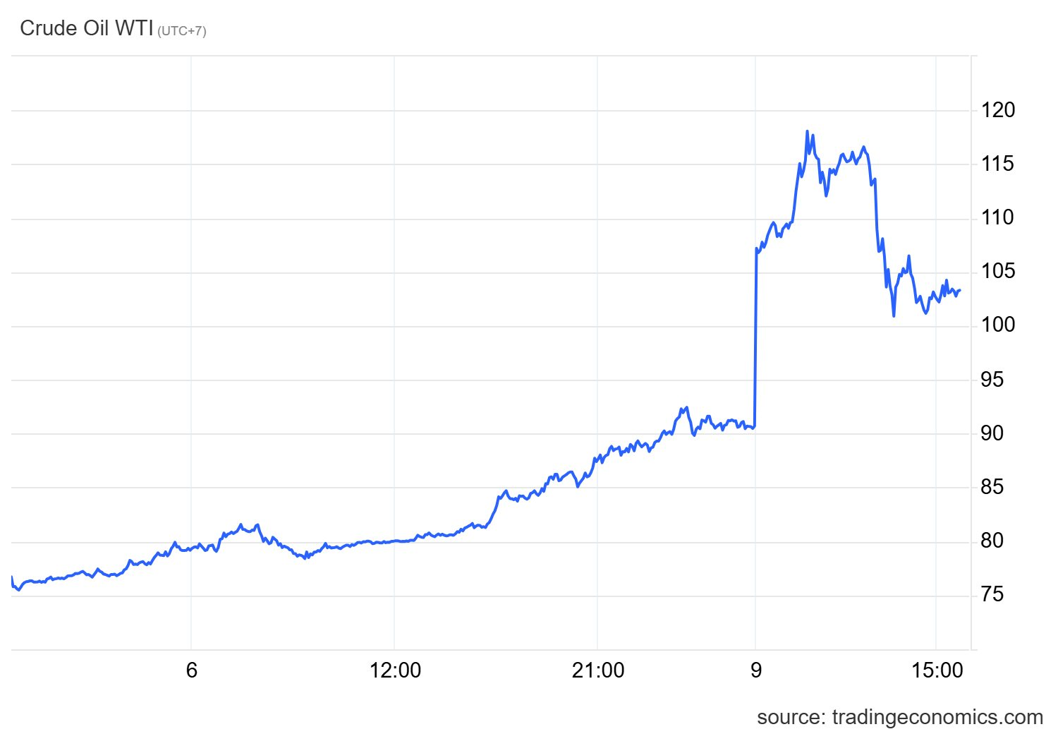 Tính riêng trong tuần trước, giá dầu thô Mỹ đã tăng khoảng 35%, đánh dấu mức tăng hàng tuần mạnh nhất kể từ khi thị trường hợp đồng tương lai dầu mỏ bắt đầu được giao dịch vào năm 1983. Đây cũng là lần đầu tiên giá dầu vượt mốc 100 USD/thùng kể từ năm 2022.