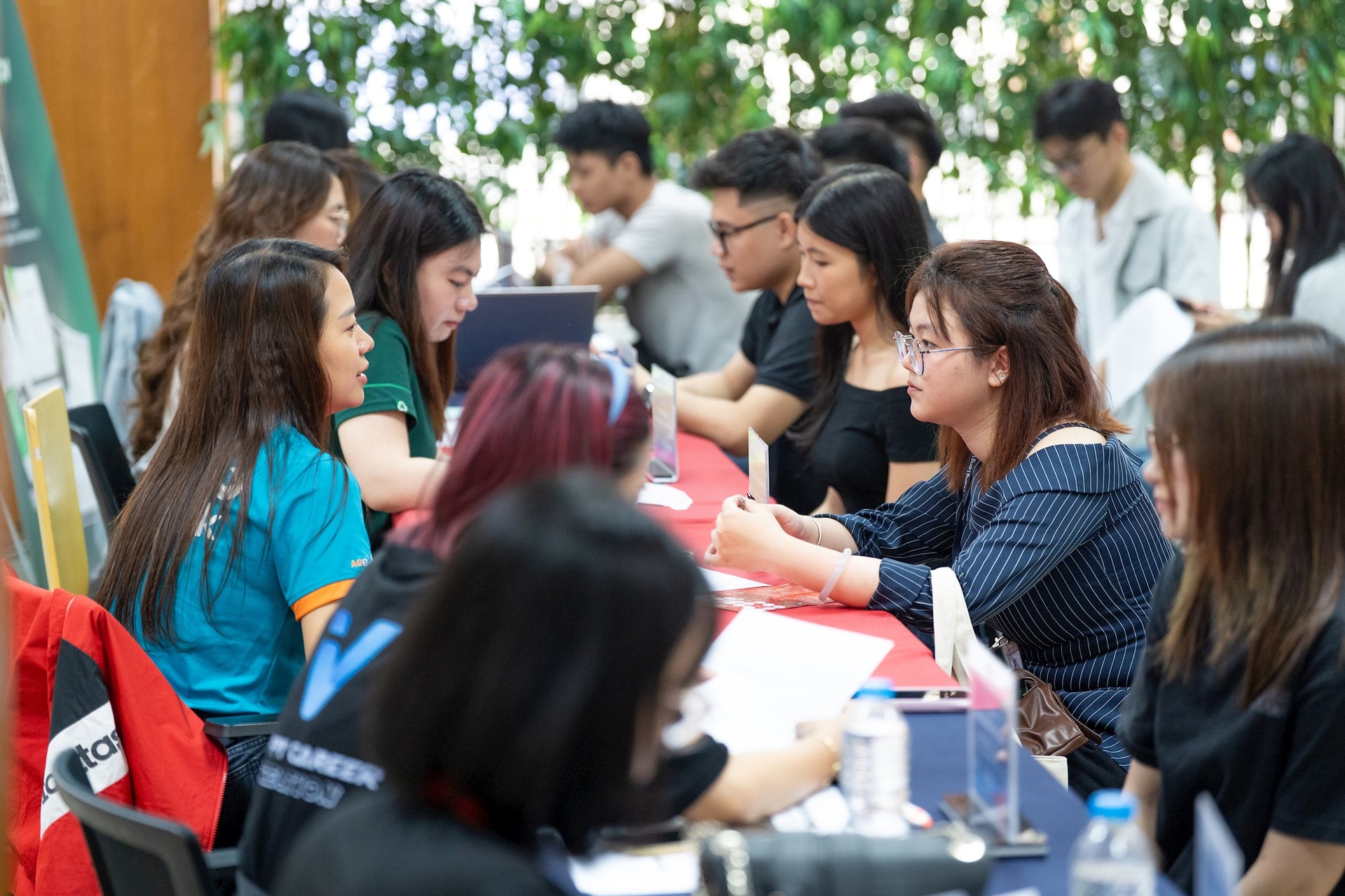 Không dừng lại ở việc tìm hiểu thông tin, sinh viên có thể trực tiếp nộp hồ sơ, tham gia phỏng vấn tại gian hàng doanh nghiệp và trao đổi với nhà tuyển dụng về định hướng nghề nghiệp, môi trường làm việc cũng như cơ hội phát triển trong tương lai.