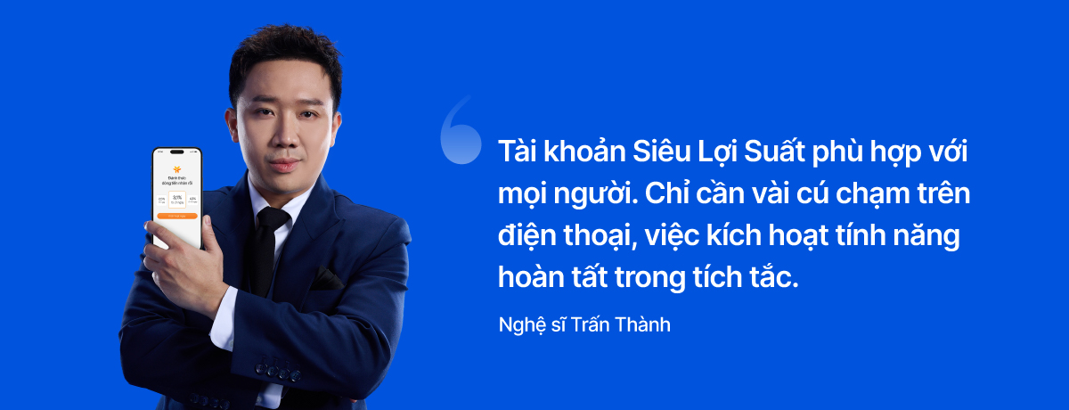 "Tôi nghĩ tài khoản này phù hợp với mọi người, nhưng đặc biệt lý tưởng cho những ai yêu thích sự linh hoạt và muốn tối ưu tài chính. Từ các bạn trẻ năng động, đam mê công nghệ, đến những người bận rộn không có nhiều thời gian quản lý tiền bạc. Ngay cả những ai thường để tiền ngủ quên trong tài khoản thì đây cũng là lúc biến những khoản tiền đó trở nên năng động, sinh lời hiệu quả hơn mỗi ngày", Trấn Thành nói thêm.