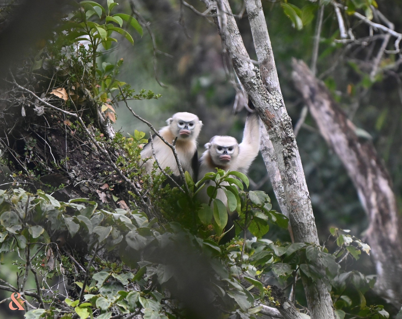 Bức ảnh ghi nhận hai cá thể mẹ con Voọc mũi hếch tại rừng Khau Ca trong đợt khảo sát tháng 12/2025.