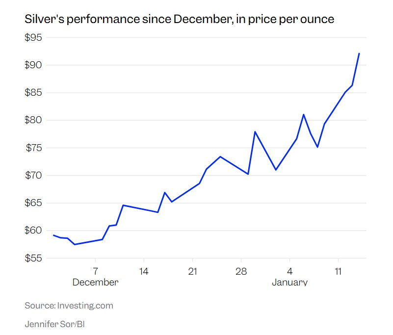 Giá bạc giao ngay đã đạt kỷ lục 93 USD/ounce. Trong vài tuần đầu năm 2026, giá bạc đã tăng 26%. Mức tăng 170% của bạc trong năm 2025 cũng vượt xa mức tăng khoảng 73% của vàng.